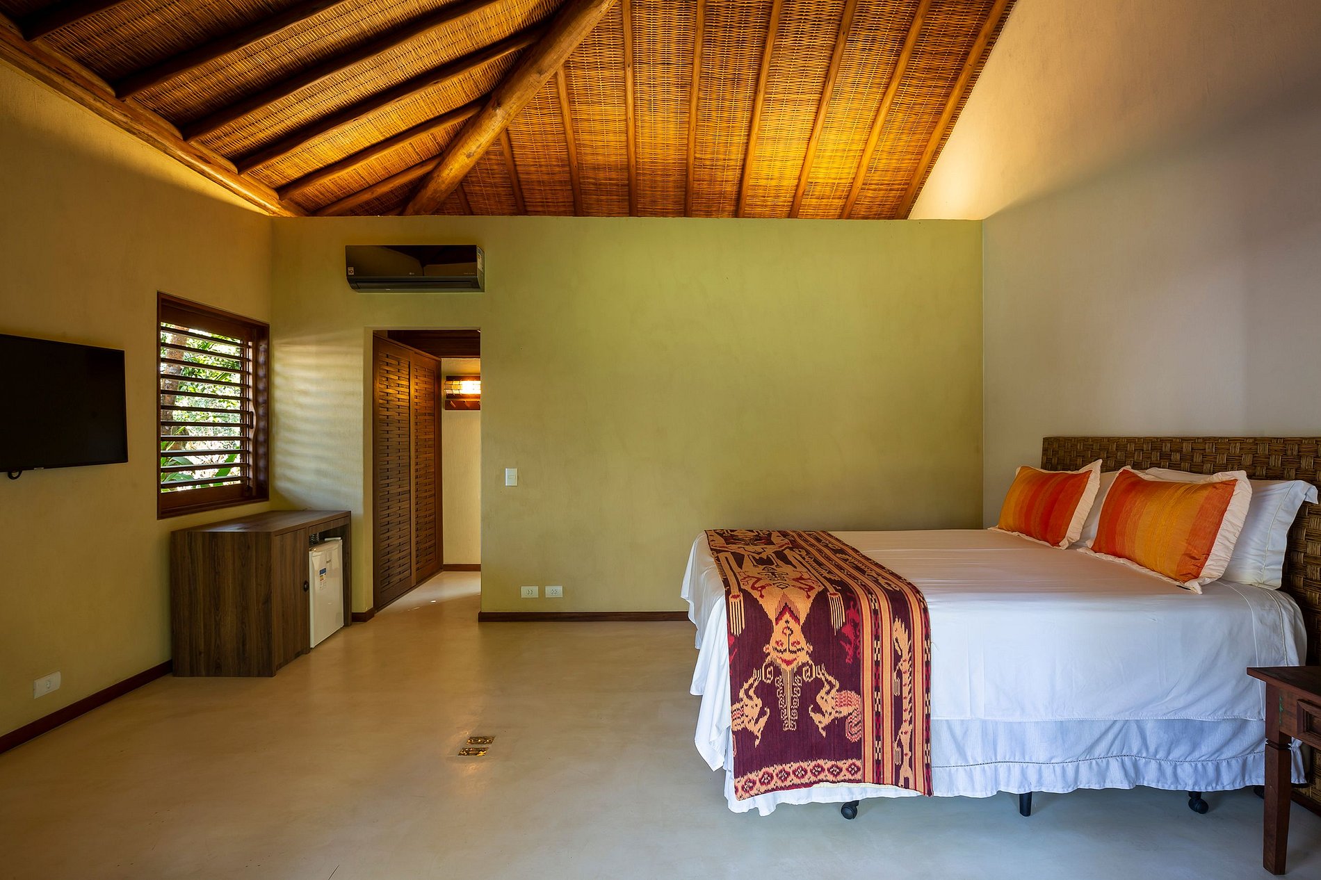 Cada bangalô oferece uma cama Queen size, frigobar, Smart TV de 50 polegadas, ar condicionado split, banheiro privativo e vistas encantadoras para o jardim com piscina. Já o Bangalô master se destaca com uma cama king size, mini cozinha, balcão e uma sala espaçosa e confortável, ideal para uma experiência ainda mais exclusiva.