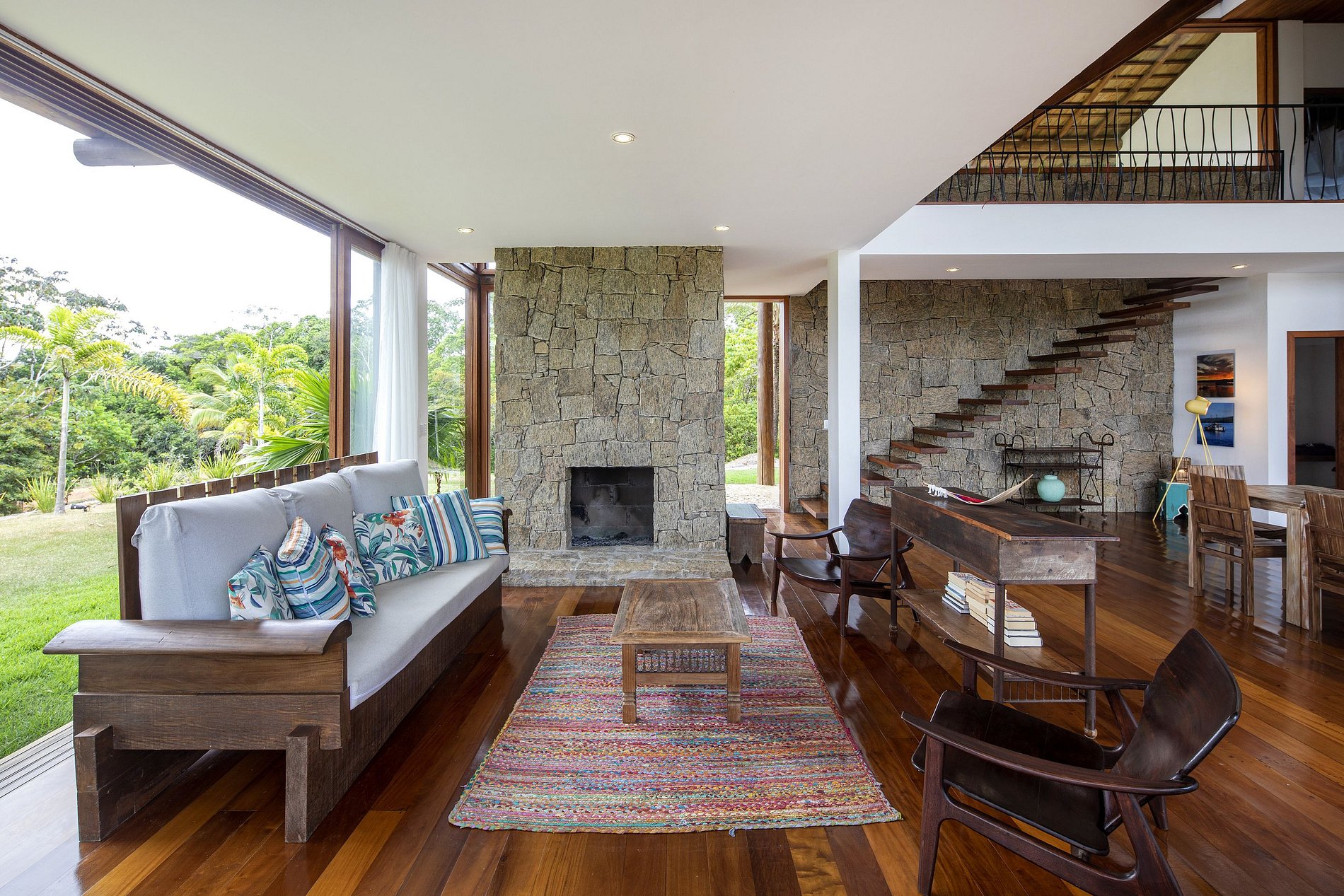 Mesa com 8 cadeiras em sua grande sala com lareira, sofá e poltronas externas