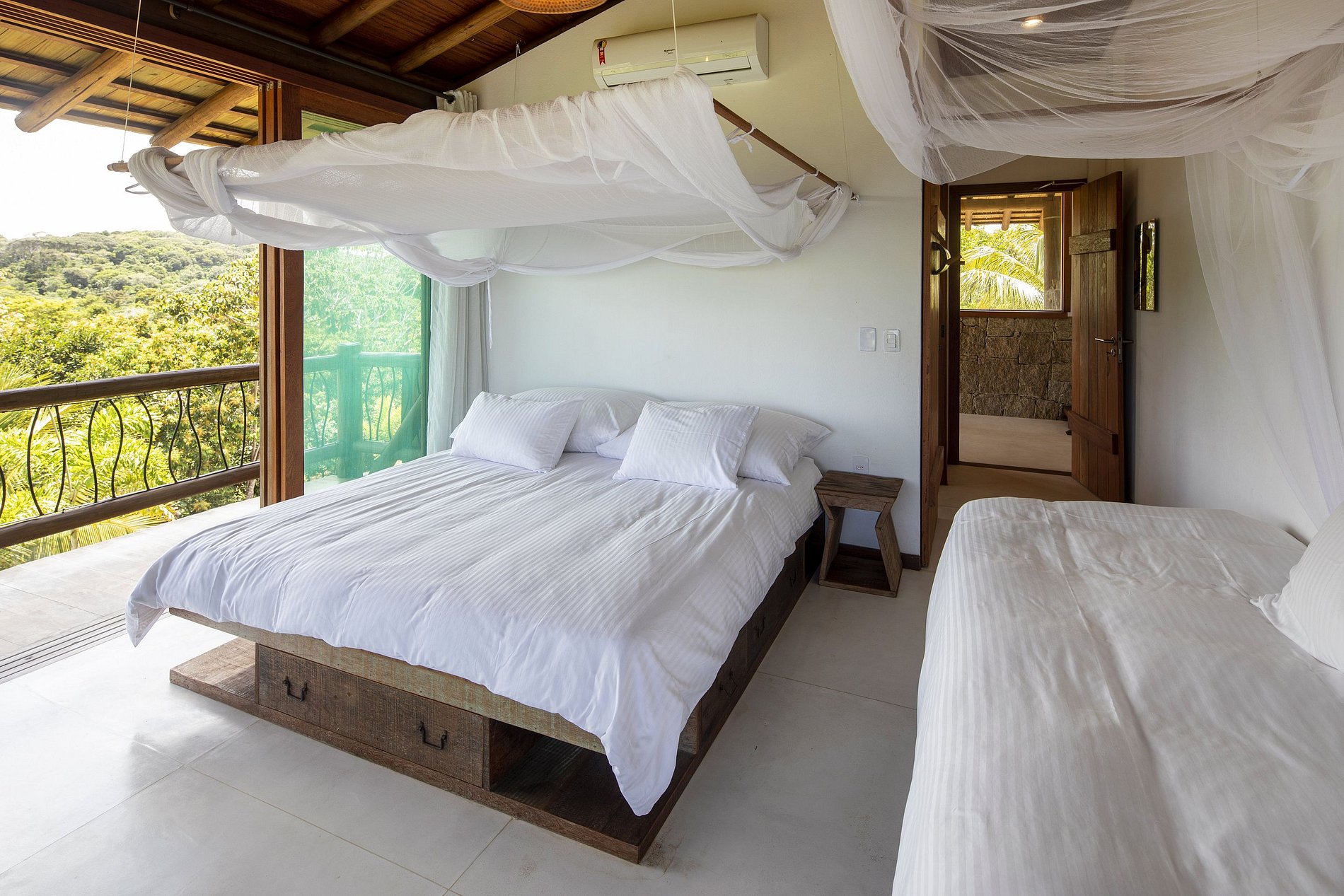 Suíte master: Cama queen-size, ar-condicionado, varanda com vista 360º para a mata, piscina, rio e o oceano.