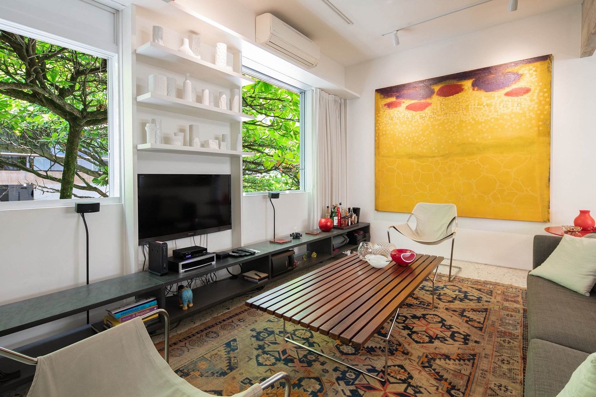 A começar por sua bela sala de estar, equipada com excelente sistema de tv, sistema som distribuído, que gera uma experiência imersiva ao assistir qualquer conteúdo audiovisual, e confortáveis sofás que proporcionam um experiência maravilhosa.