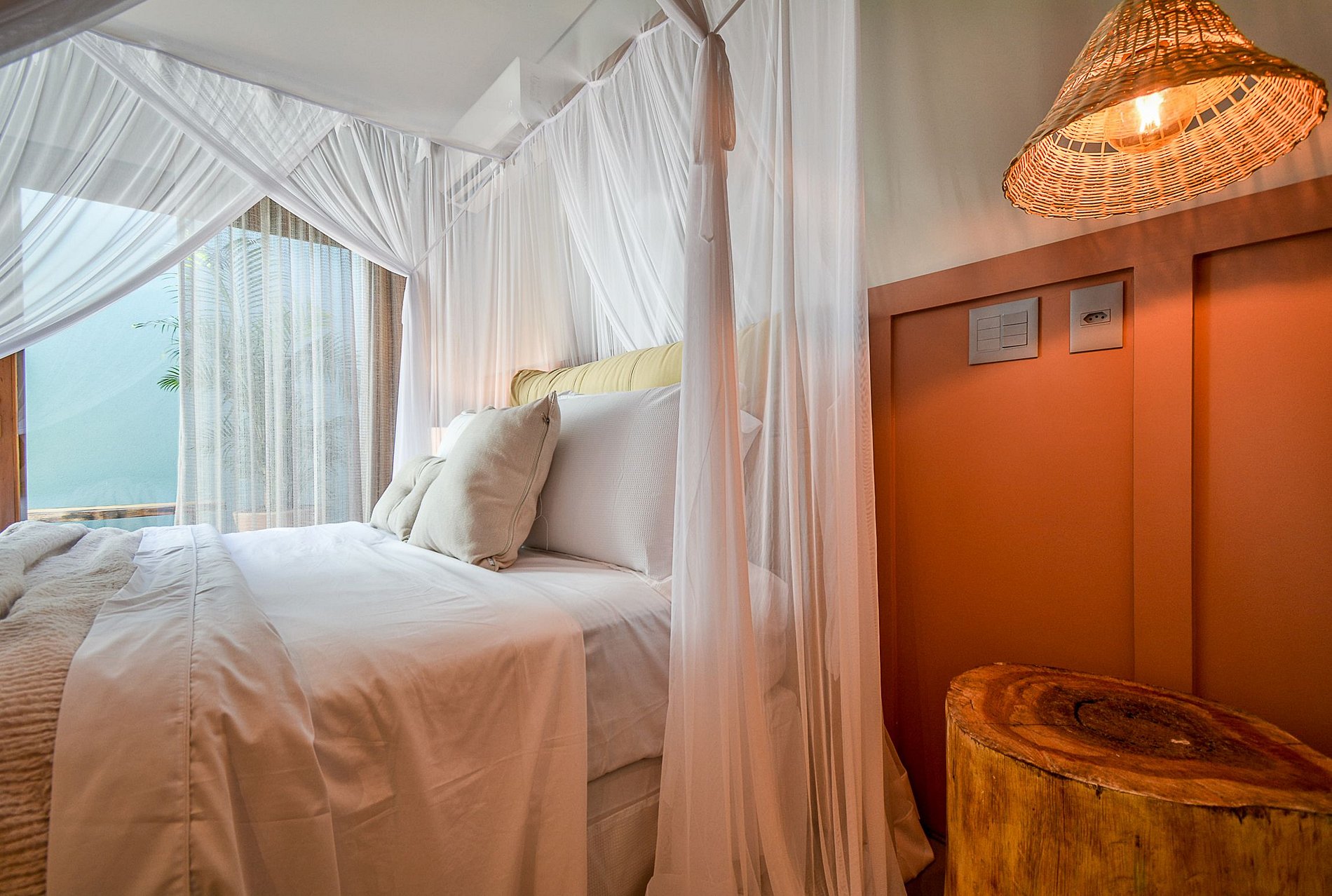 A sala de estar é bem iluminada naturalmente e conta com um design tropical de encher os olhos, que faz uso de fibra natural das paredes até o teto, com muito requinte e luxo, além de um projeto de iluminação artificial rico.