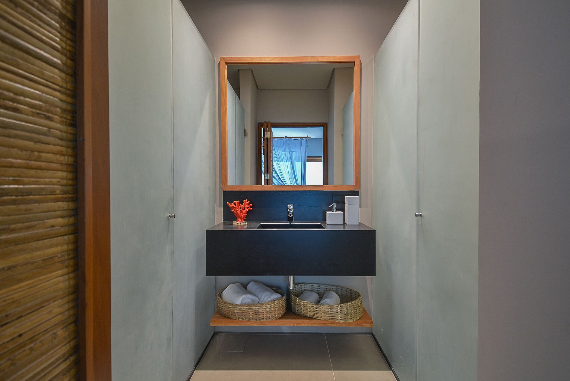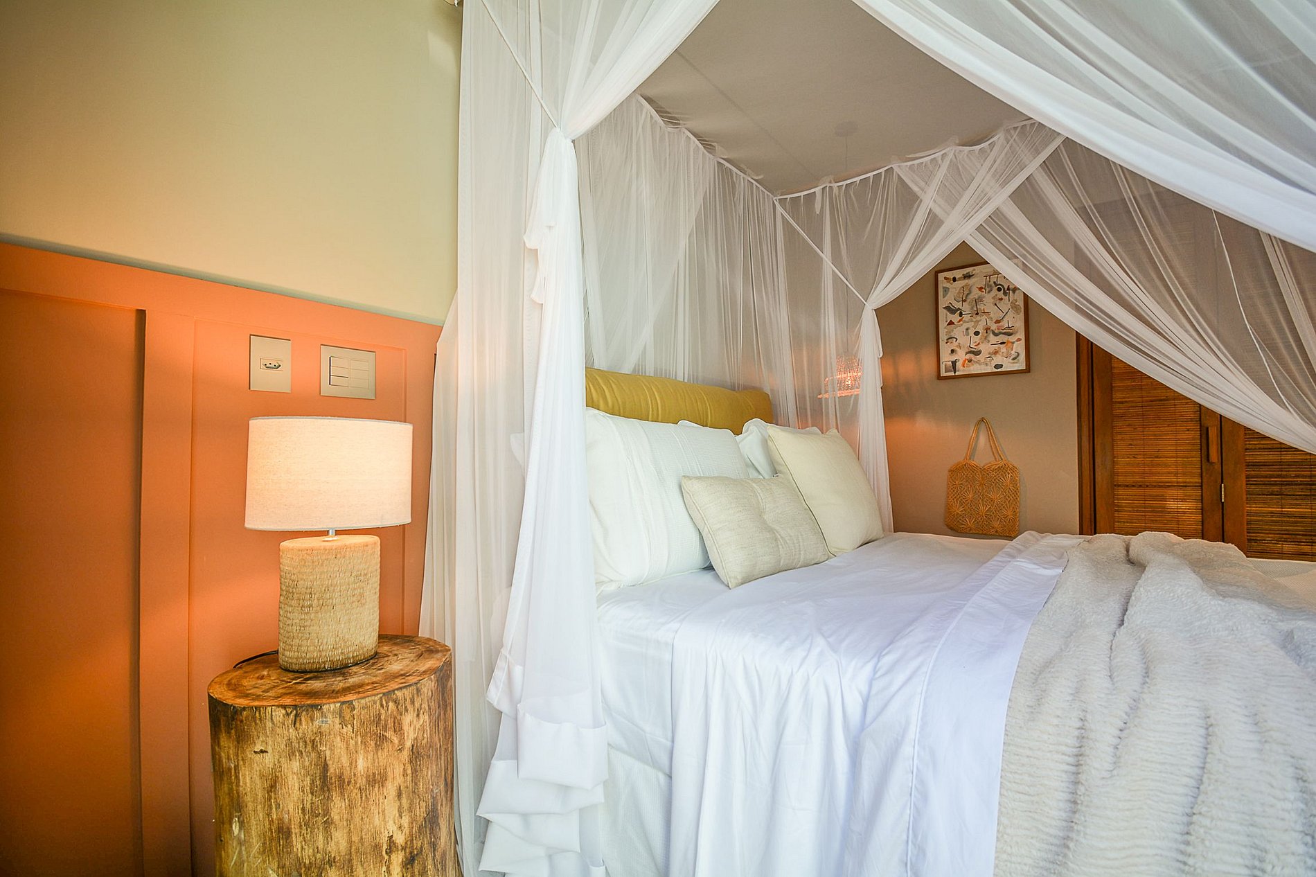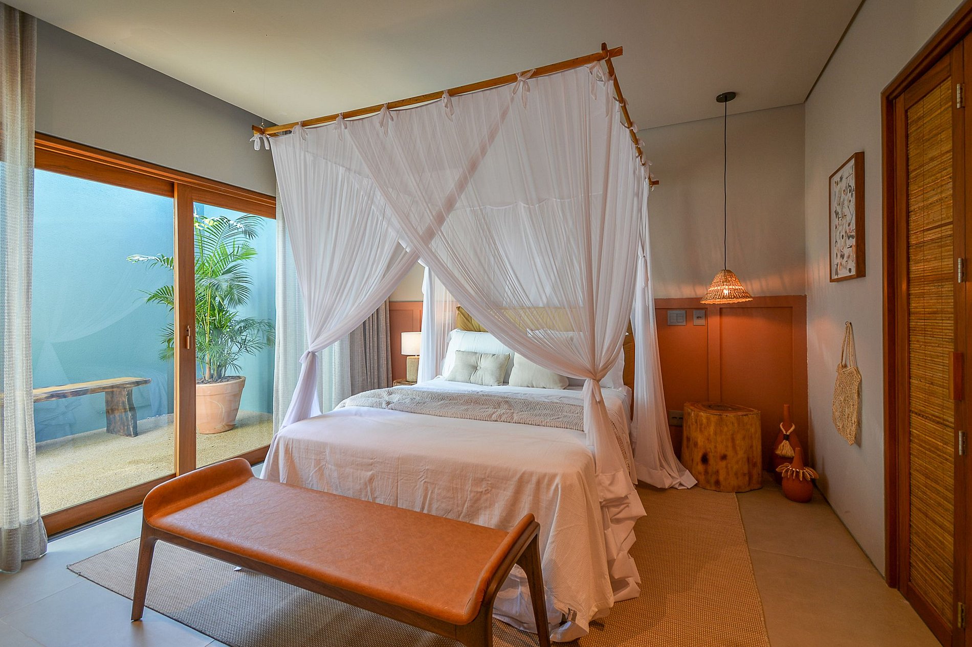 A sala de estar é bem iluminada naturalmente e conta com um design tropical de encher os olhos, que faz uso de fibra natural das paredes até o teto, com muito requinte e luxo, além de um projeto de iluminação artificial rico.