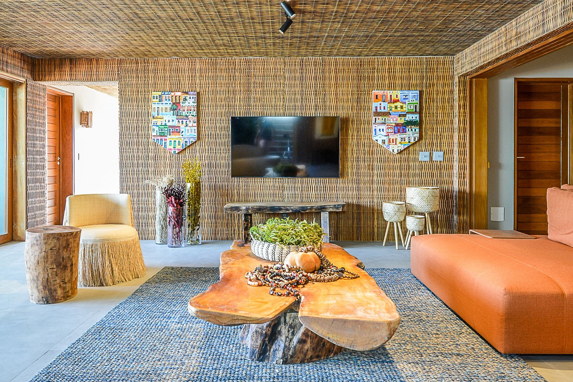 A sala de estar é bem iluminada naturalmente e conta com um design tropical de encher os olhos, que faz uso de fibra natural das paredes até o teto, com muito requinte e luxo, além de um projeto de iluminação artificial rico.