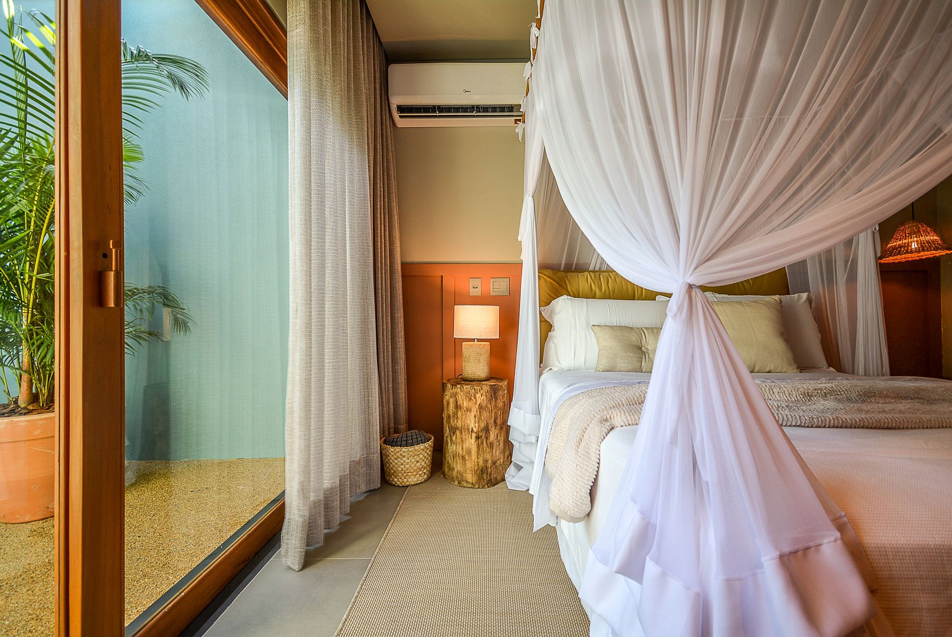 A sala de estar é bem iluminada naturalmente e conta com um design tropical de encher os olhos, que faz uso de fibra natural das paredes até o teto, com muito requinte e luxo, além de um projeto de iluminação artificial rico.