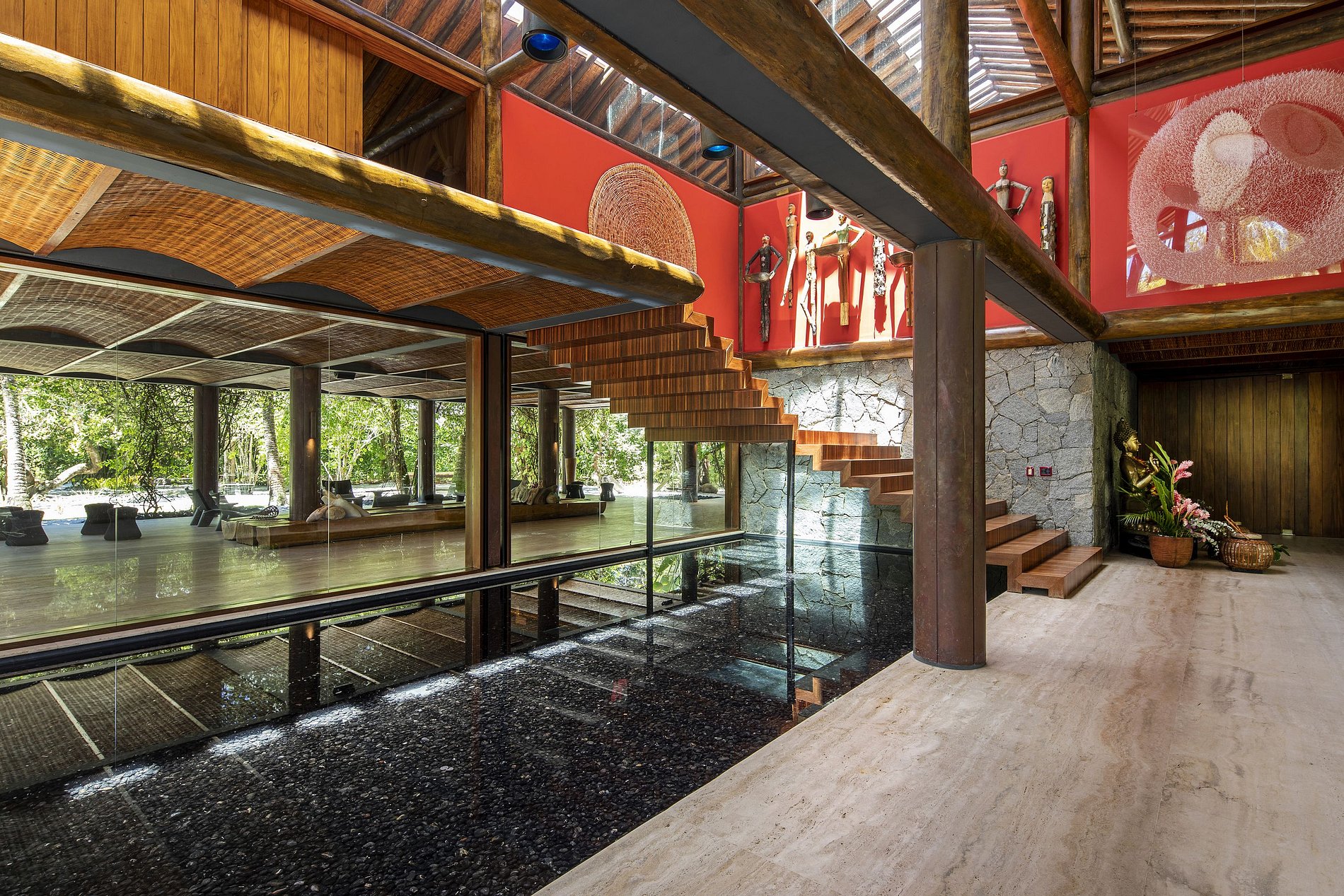 Localizado em uma área rica em flora e fauna, você pode ter a localização perfeita para se exercitar ao ar livre ou optar por fazê-lo em na academia da propriedade.Tem até um salão de beleza, perfeito para a preparação de eventos.Os 28 funcionários da casa, compõem a equipe profissional que oferecem serviços de primeira qualidade em qualquer um das suítes, no jardim ou na praia, dia e noite.