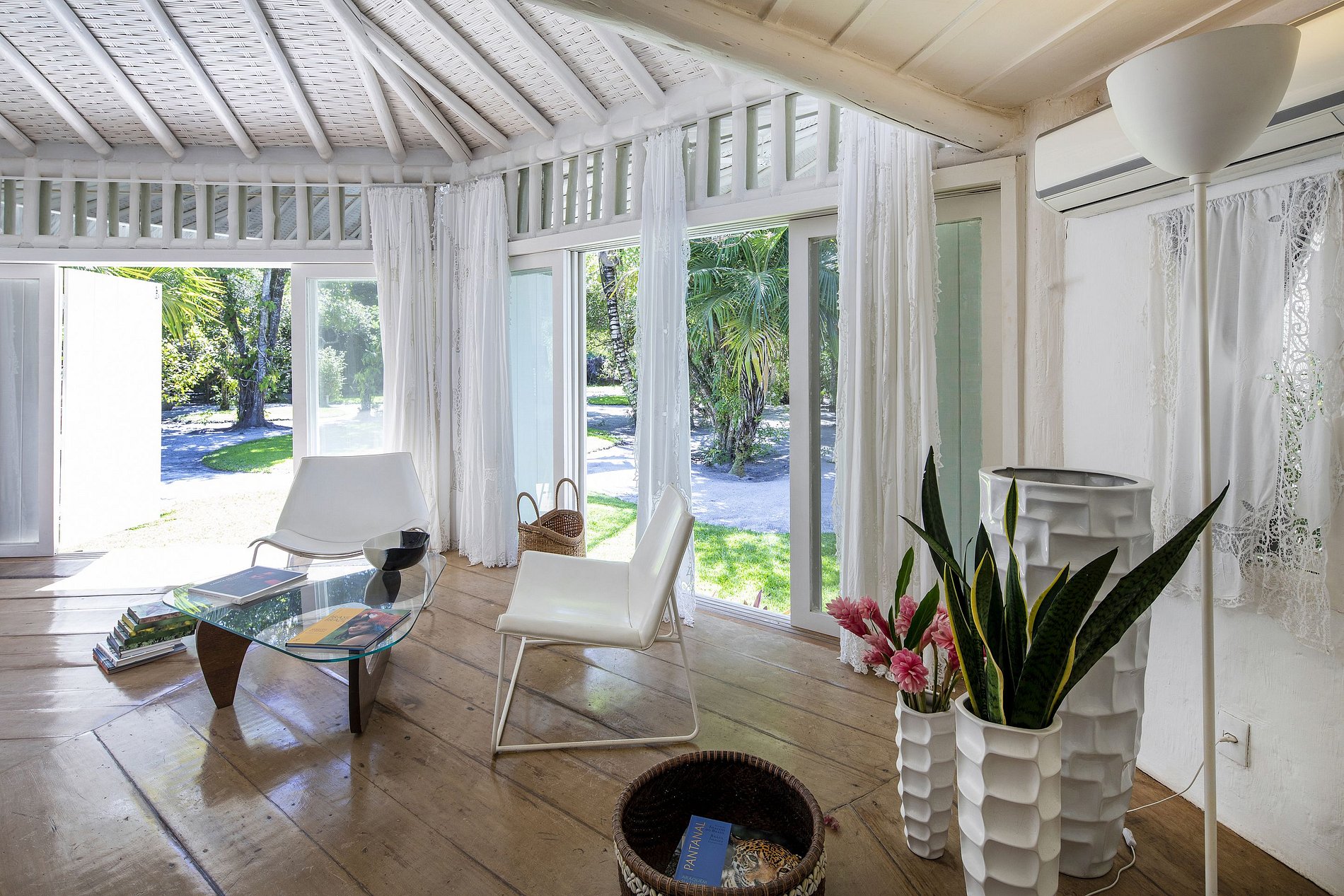 A casa principal de 1.000 m² tem sala de estar oferece um volume espetacular, com pé direito alto. Espelho d'água, obras de arte, madeira nobres, mármores, a grande área luminosa abre numa longa varanda onde pode ser organizado, almoços, jantares ou eventos.
