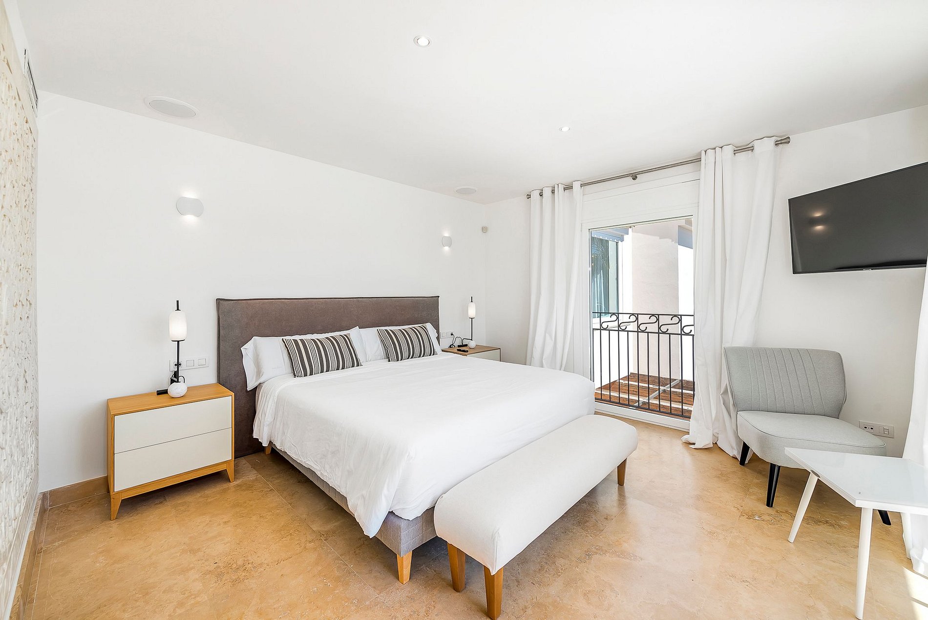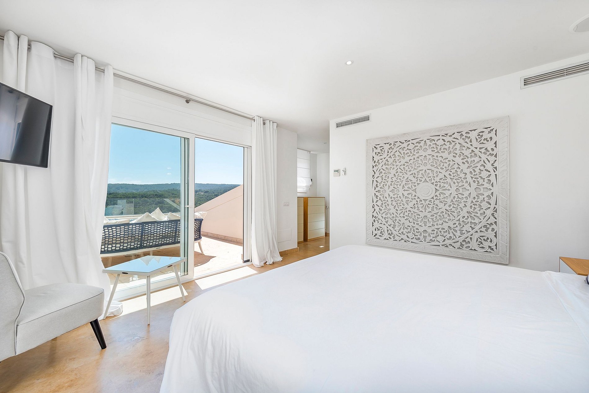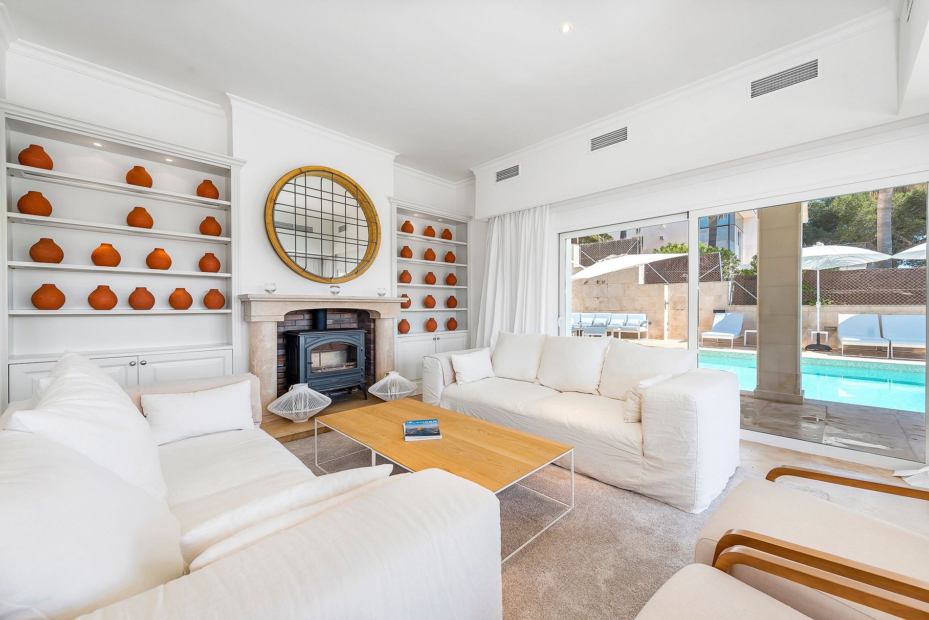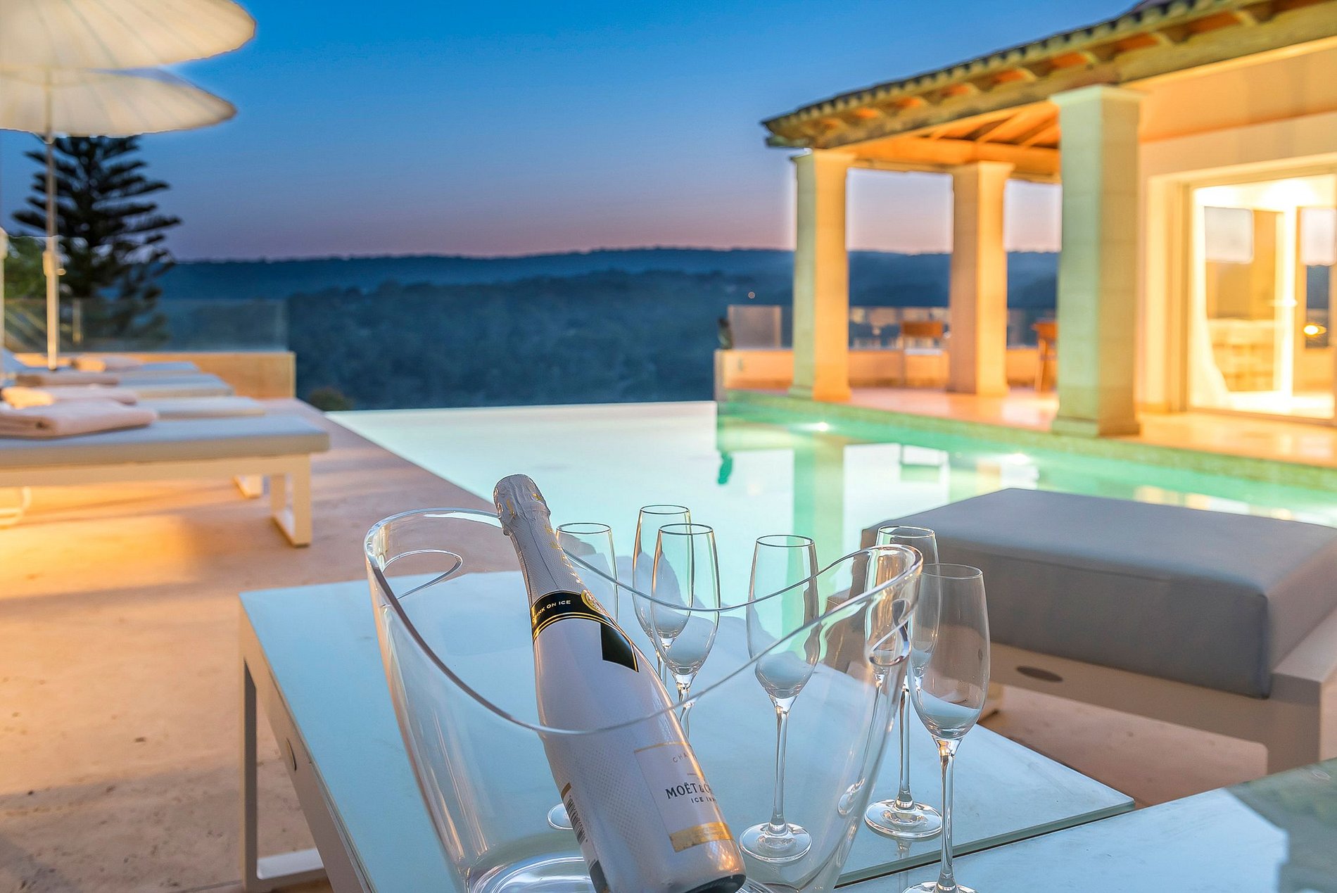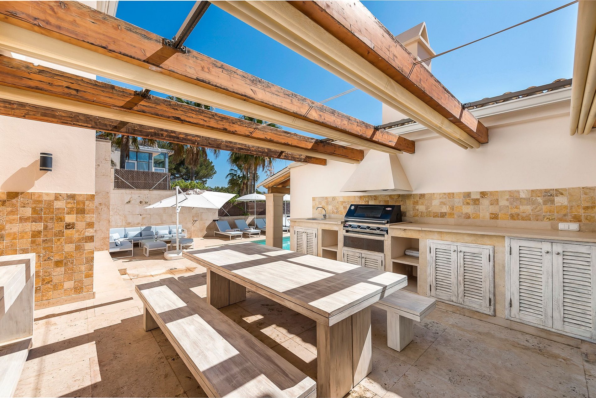 Ao lado da bela piscina infinita há uma cozinha ao ar livre com churrasqueira e uma área de jantar coberta. Tanto no exterior como no interior, os hóspedes podem ouvir a sua música favorita a qualquer momento graças ao sistema de música Sonos.