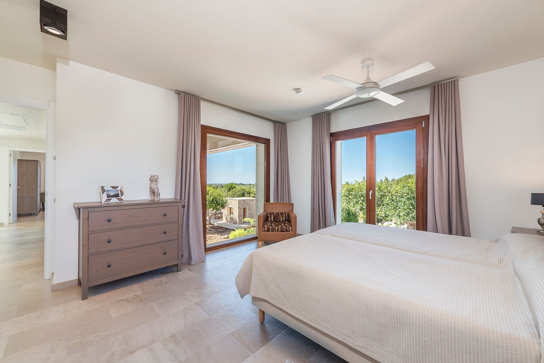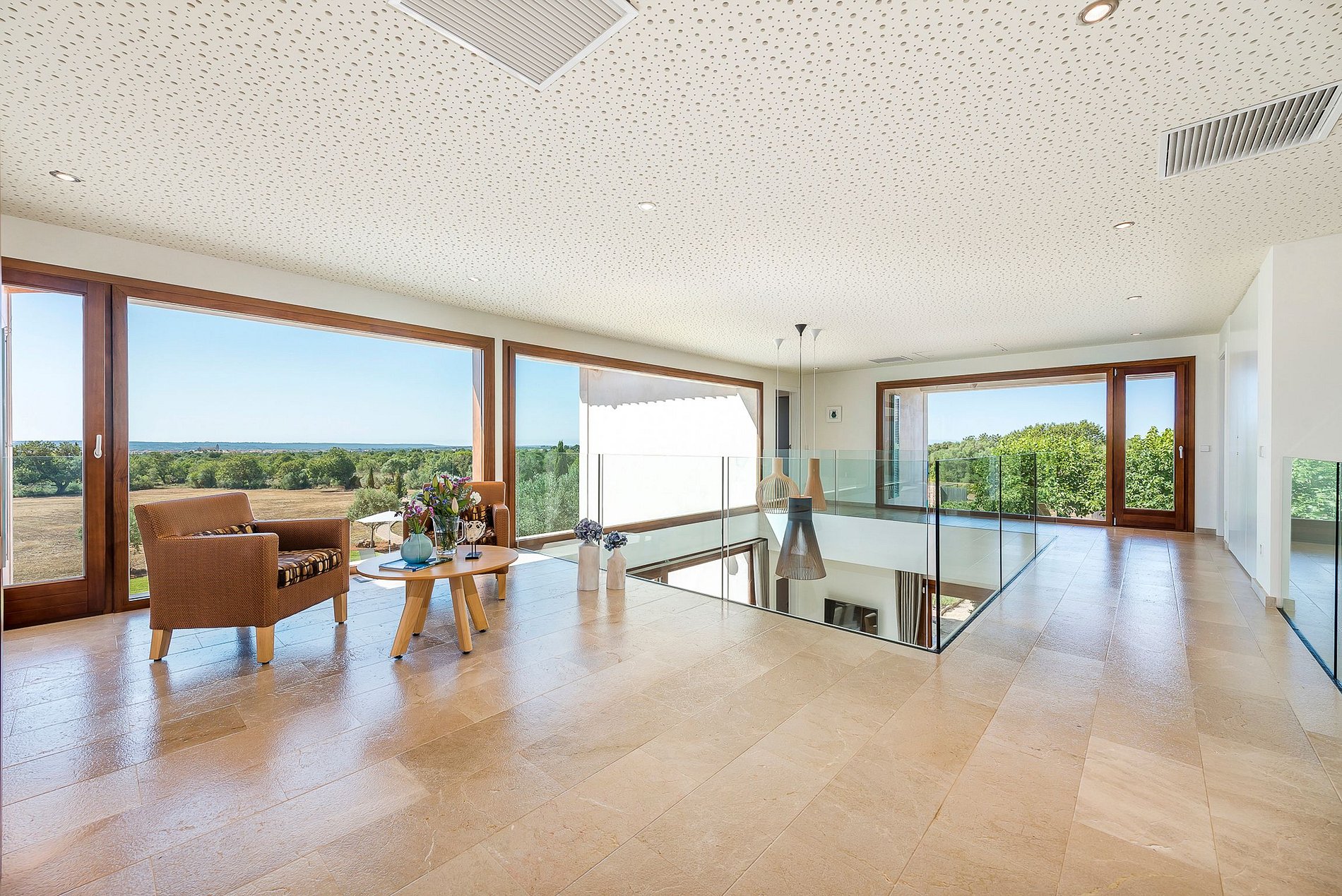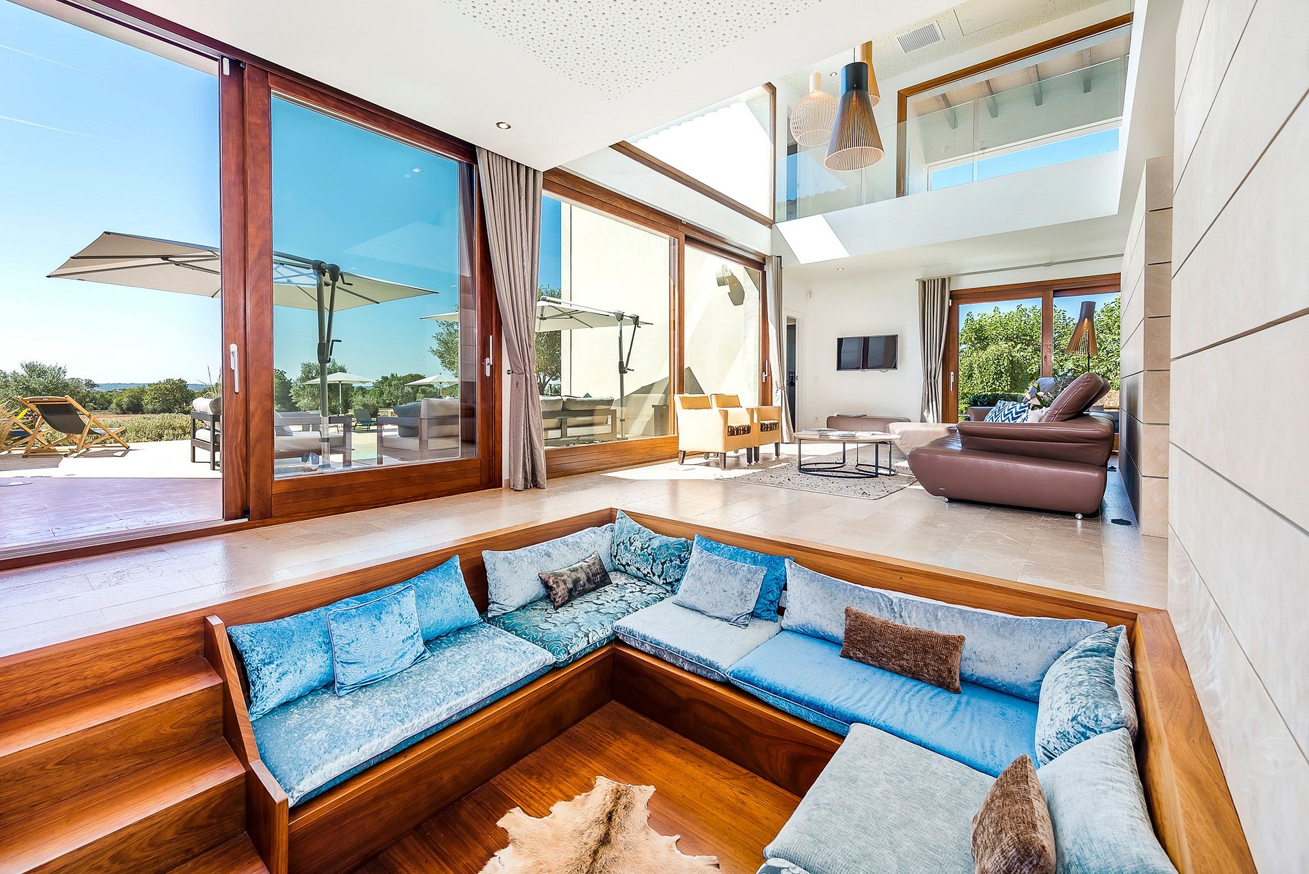 Existem vários terraços cobertos e descobertos com espreguiçadeiras de onde você pode relaxar e desfrutar uma vista magnífica sobre a paisagem de Mallorca.