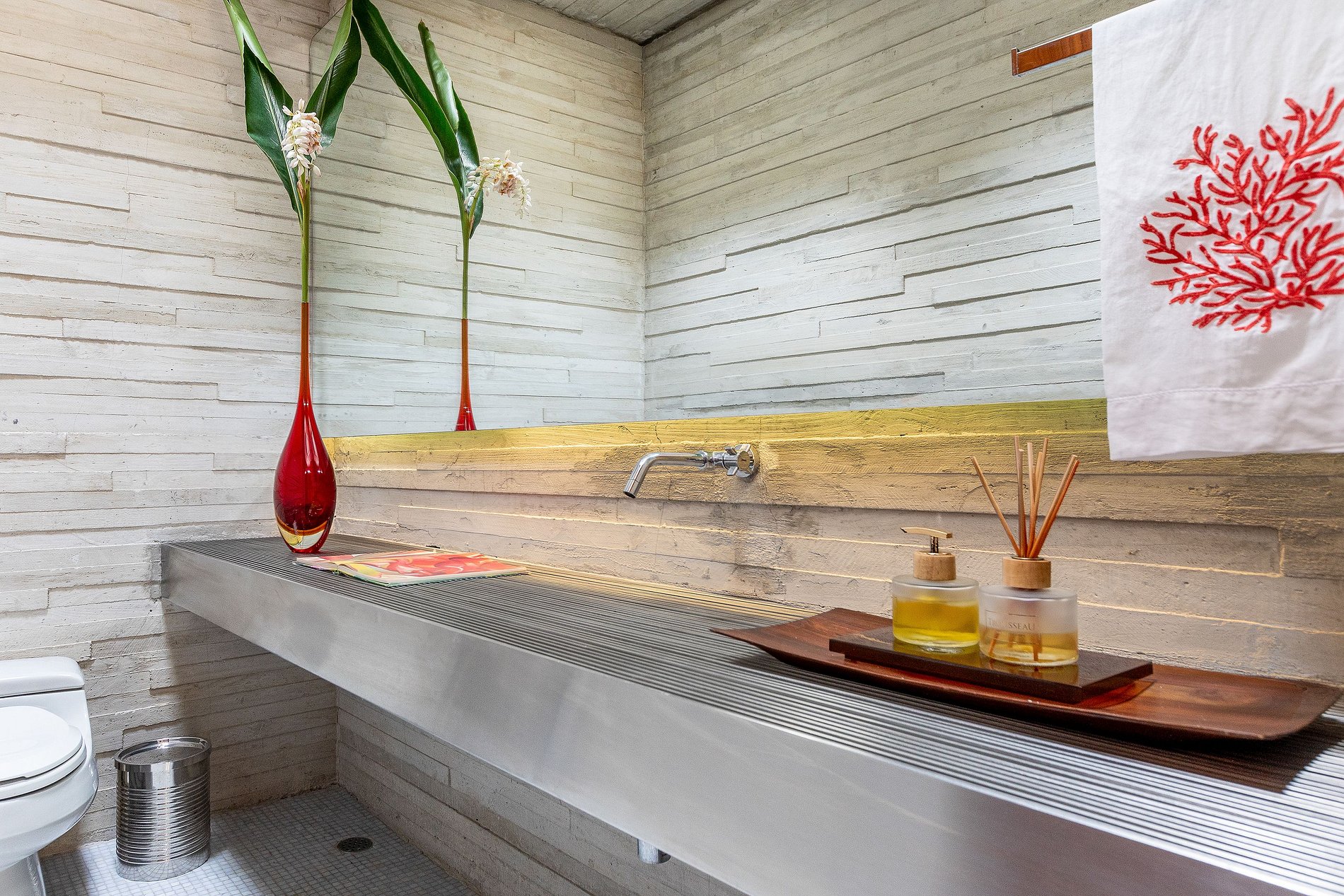 • Suíte 5: Com cama queen-size, esta suíte tem armários em área independente e um pátio externo com vista para a floresta, oferecendo total privacidade. O pátio é decorado com pedras naturais e espreguiçadeiras assinadas por Sérgio Rodrigues, criando um refúgio de paz e conforto.