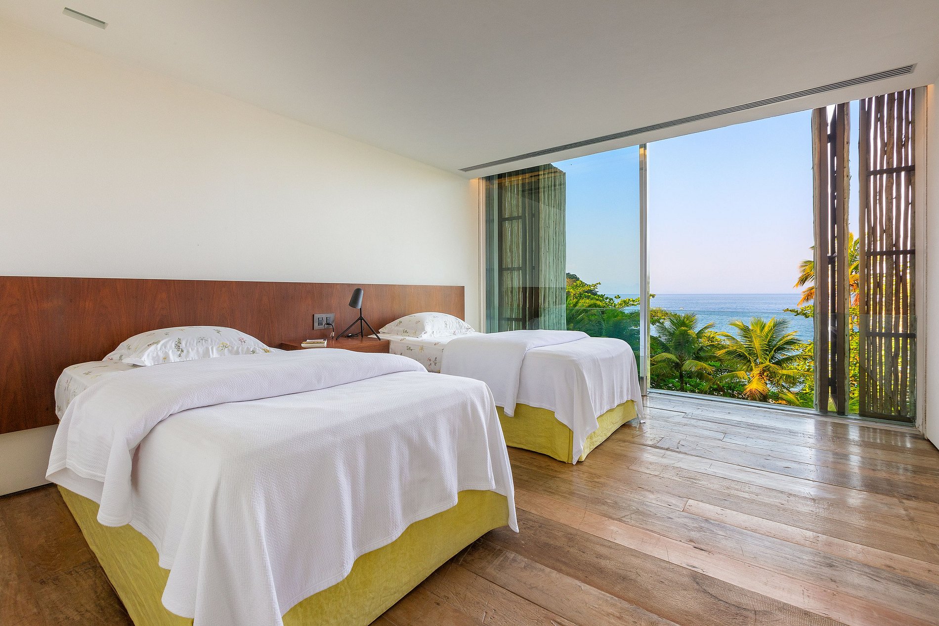 • Suíte 2 e Suíte 3: Ambas contam com armários em área independente, duas camas de solteiro extras com camas auxiliares e banheiros revestidos com pastilhas Bisazza, além de sanitários Kohler por sucção e banheiras com vistas deslumbrantes para o mar.