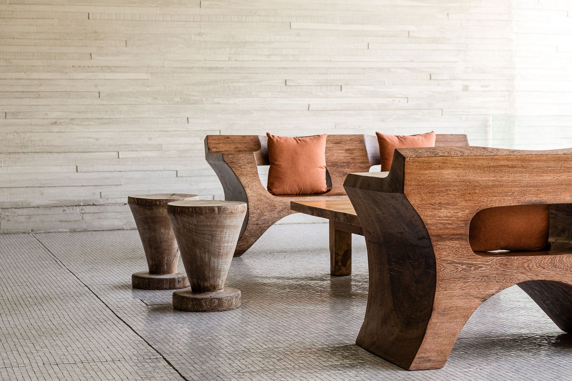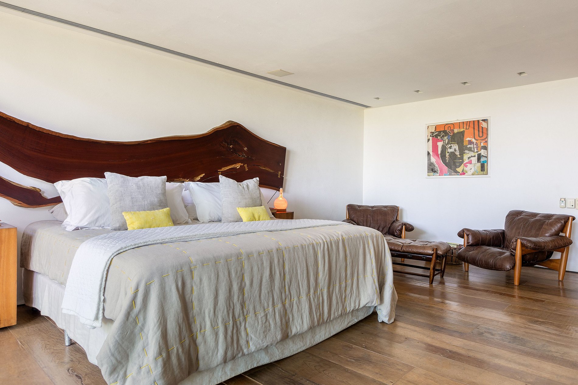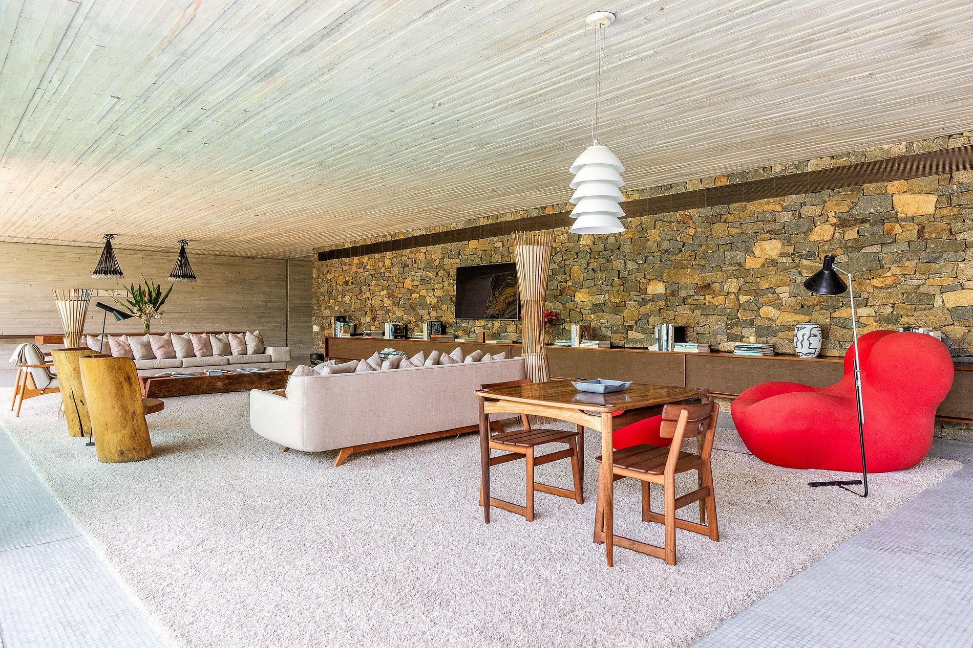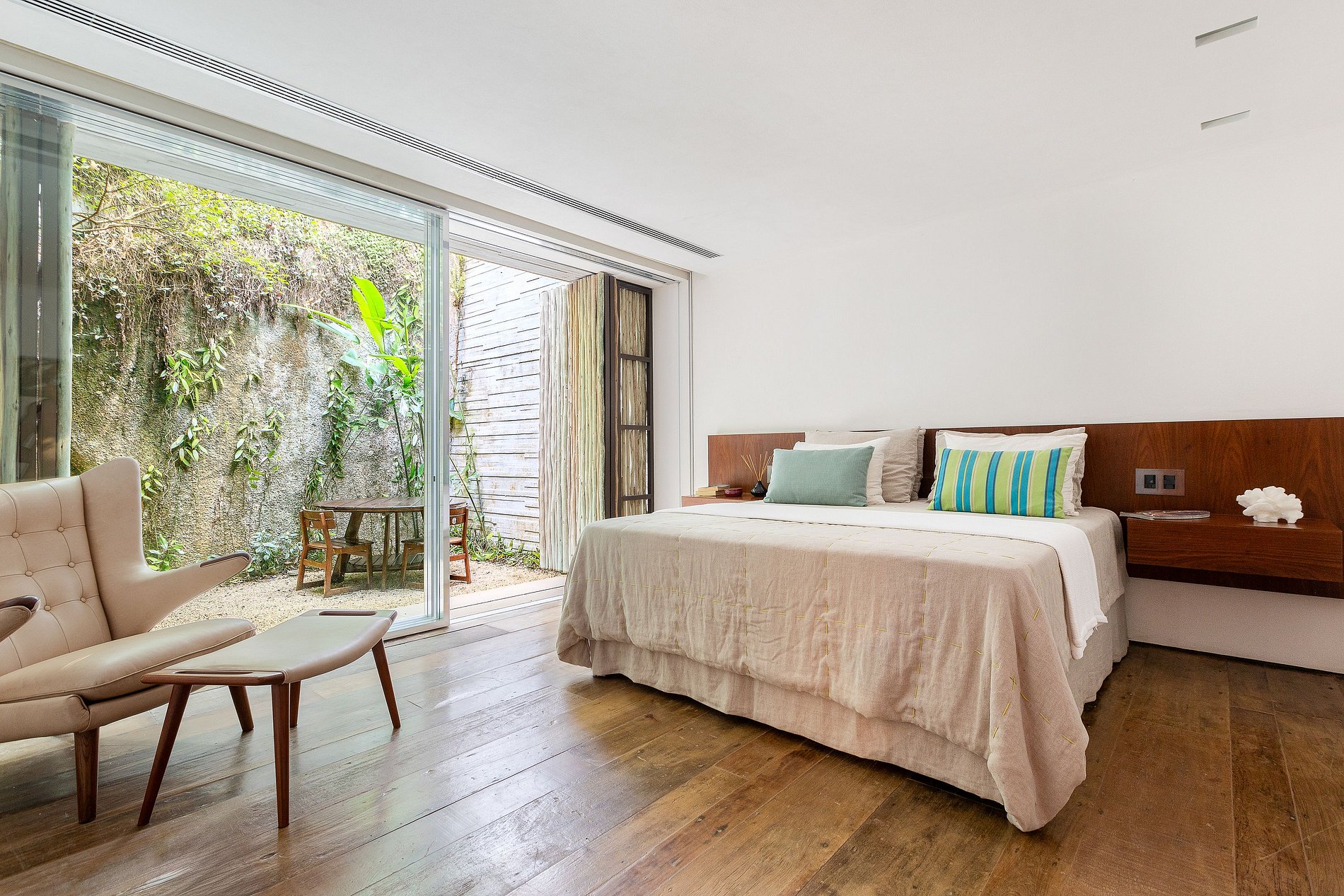 • Suíte 5: Com cama queen-size, esta suíte tem armários em área independente e um pátio externo com vista para a floresta, oferecendo total privacidade. O pátio é decorado com pedras naturais e espreguiçadeiras assinadas por Sérgio Rodrigues, criando um refúgio de paz e conforto.