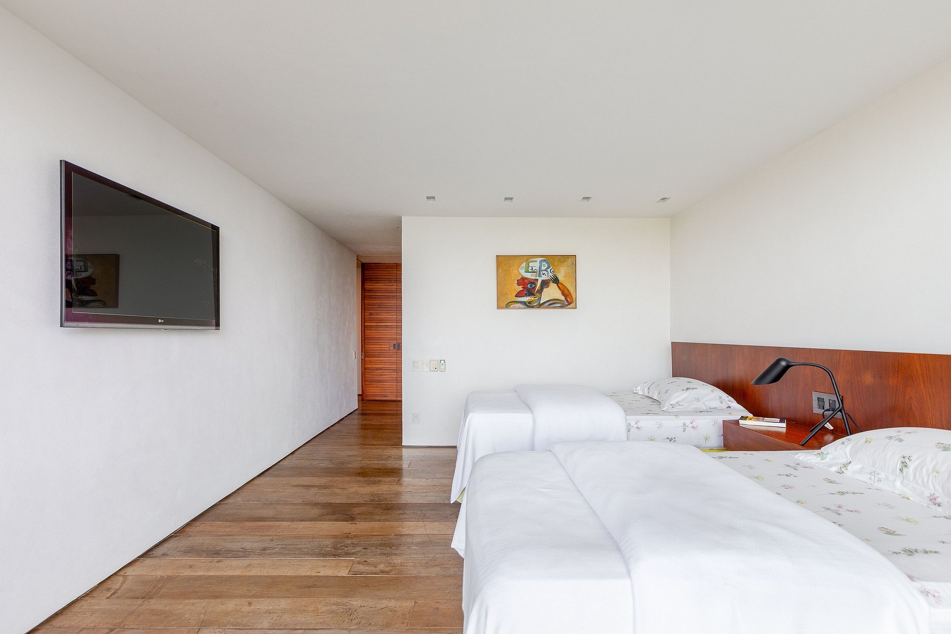 • Suíte 2 e Suíte 3: Ambas contam com armários em área independente, duas camas de solteiro extras com camas auxiliares e banheiros revestidos com pastilhas Bisazza, além de sanitários Kohler por sucção e banheiras com vistas deslumbrantes para o mar.