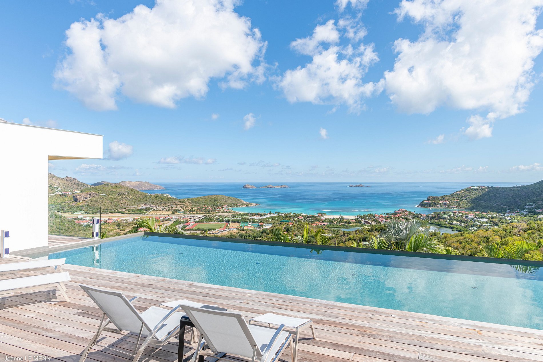 A ampla área social em conceito aberto inclui uma cozinha totalmente equipada, uma sala de estar elegante e portas de vidro do chão ao teto que emolduram as águas turquesa da baía de St. Jean. Do lado de fora, o espaçoso terraço conta com piscina infinita aquecida, área para refeições ao ar livre e uma televisão retrátil — perfeita para noites sob as estrelas.