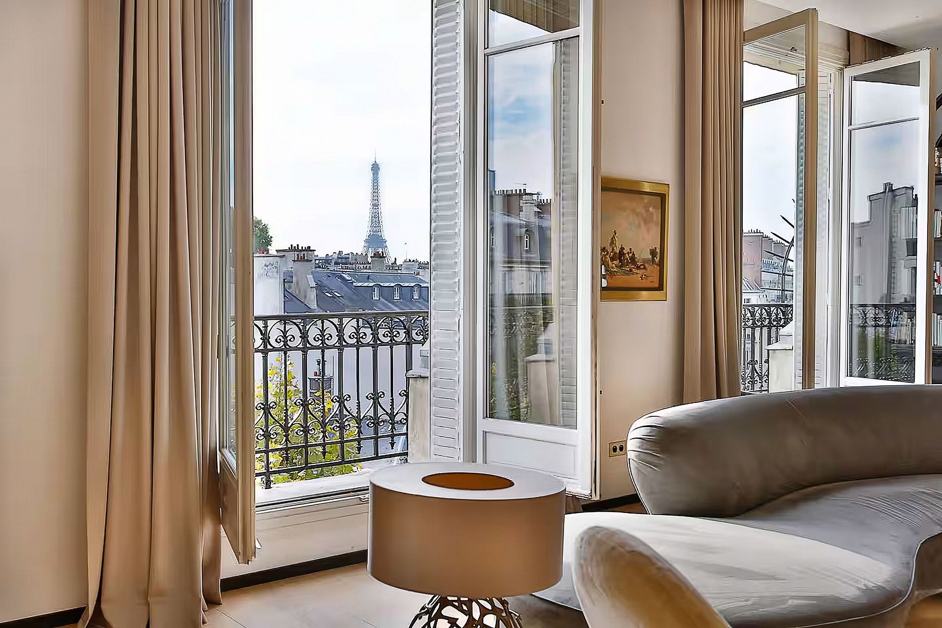 Vistas Panorâmicas Deslumbrantes: Cada janela enquadra vistas icônicas de Paris. Uma extensa varanda oferece vistas espetaculares da rua, incluindo a Torre Eiffel, a cúpula dourada do Les Invalides, as torres de La Défense e o imponente Panthéon. Já os fundos do apartamento revelam uma tranquila vista dos jardins da antiga residência de Karl Lagerfeld.