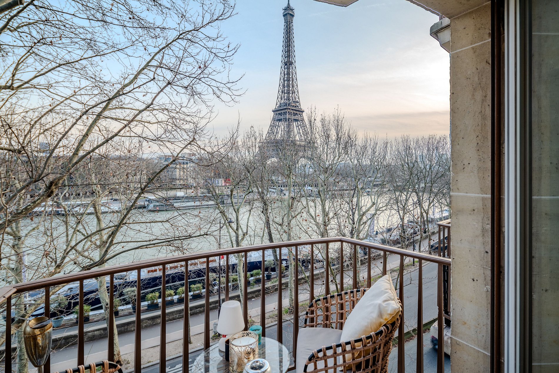 O que o diferencia são as adições únicas de duas pequenas varandas, cada uma oferecendo seu charme e propósito distintos. A primeira varanda é dedicada ao relaxamento e lazer, projetada como um lounge ao ar livre onde se pode descontrair e absorver o ambiente sereno. A segunda varanda é um espaço encantador com uma mesa e duas cadeiras, perfeitamente posicionadas para oferecer vistas diretas da majestosa Torre Eiffel e do tranquilo Rio Sena. Estas varandas proporcionam uma oportunidade rara de desfrutar da beleza icônica de Paris em um ambiente privado e íntimo.