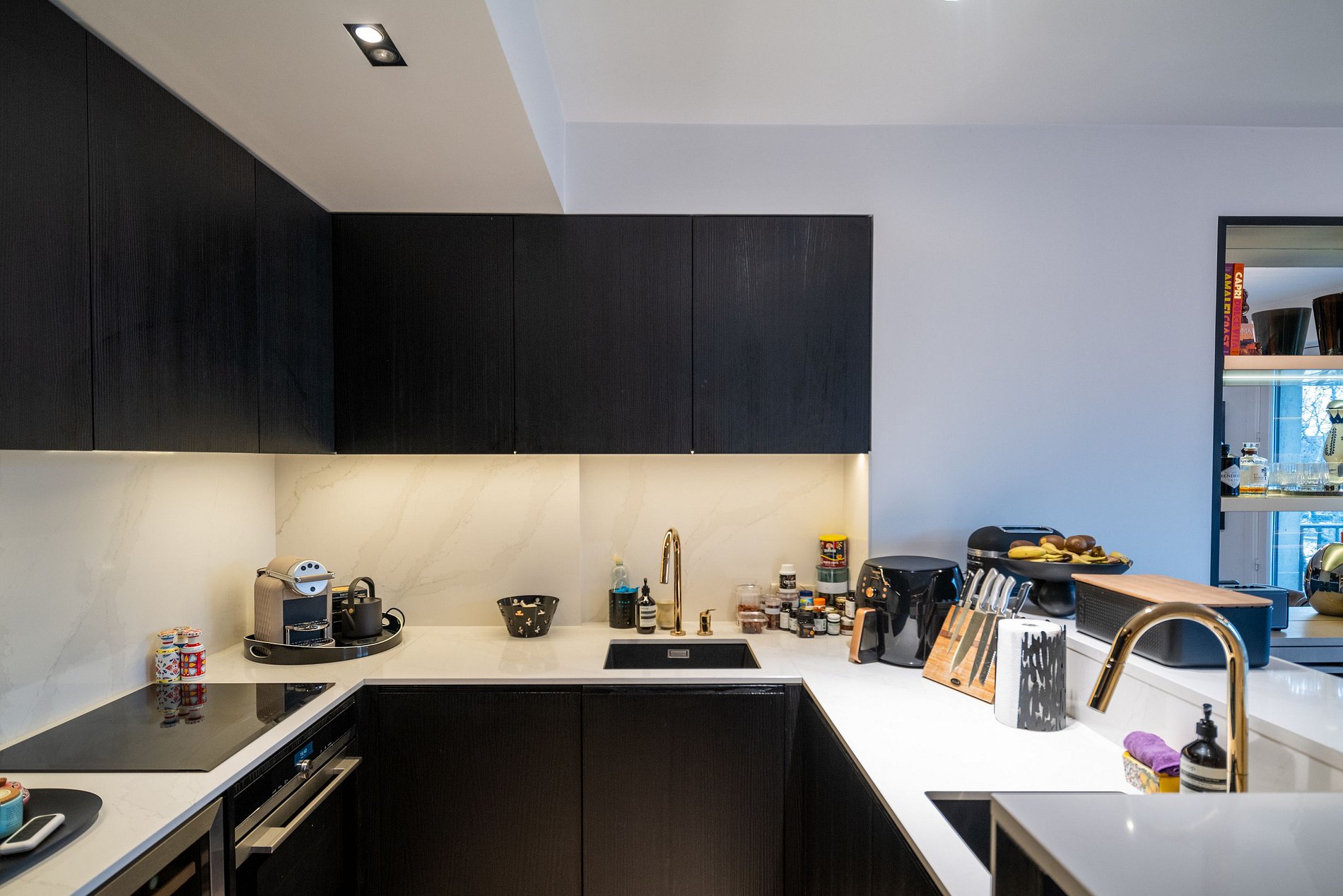 No interior, o apartamento possui uma área de estar elegante que se integra perfeitamente a uma cozinha totalmente equipada, exalando elegância e praticidade. A cozinha é um paraíso culinário, equipada com aparelhos de última geração e amplo espaço, tornando o ato de cozinhar uma experiência deliciosa. Ao lado da cozinha, há uma mesa de jantar, ideal para refeições íntimas ou para entreter convidados, tudo isso enquanto se desfruta do ambiente chique do interior do apartamento.