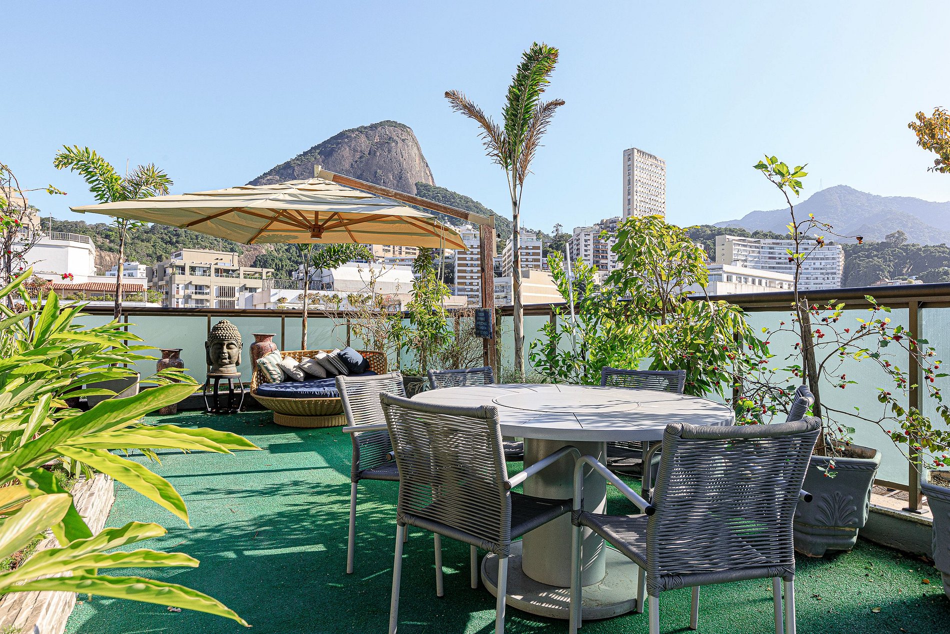 São 550 m² de apartamento, com um amplo terraço com vistas panorâmicas para a cidade, avistando de forma privilegiada o morro dois irmãos com muito destaque, o Cristo Redentor, e a floresta da Tijuca. O terraço é lindo, arborizado e colorido por plantas e flores diversas. Para se refrescar e relaxar você pode tomar um bom banho de piscina ou receber uma massagem dos jatos da hidromassagem.