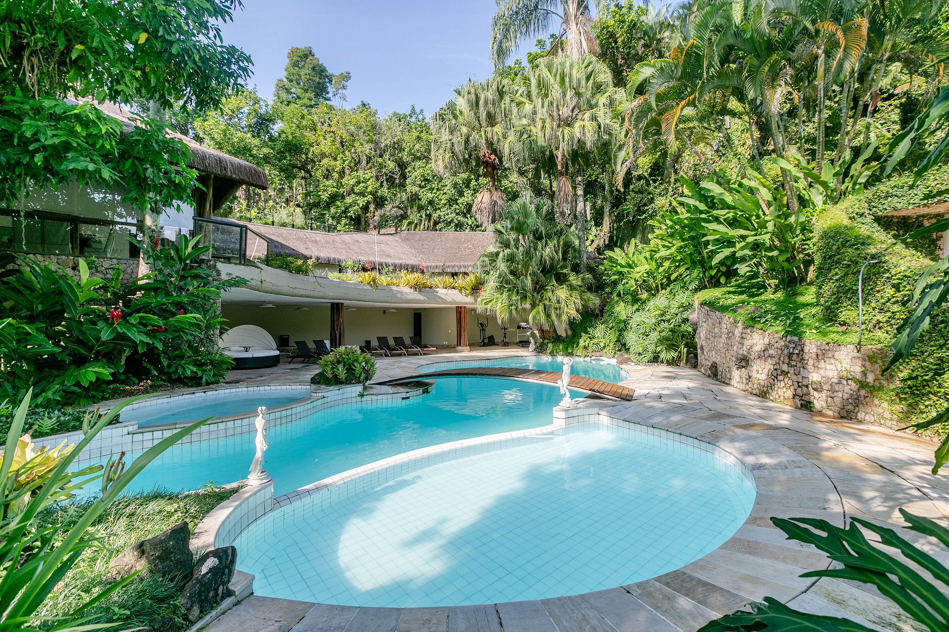 Autêntica e Luxuosa Casa de Sapê construída essencialmente de madeira quari-quara com telhados em sapê e está localizada frente ao mar, com uma vista magnífica da baía de Mangaratiba. Tem sua própria praia privada, um píer, heliporto, uma magnífica piscina e jacuzzi. A residência tem capacidade para receber até 18 convidados em 8 suítes.