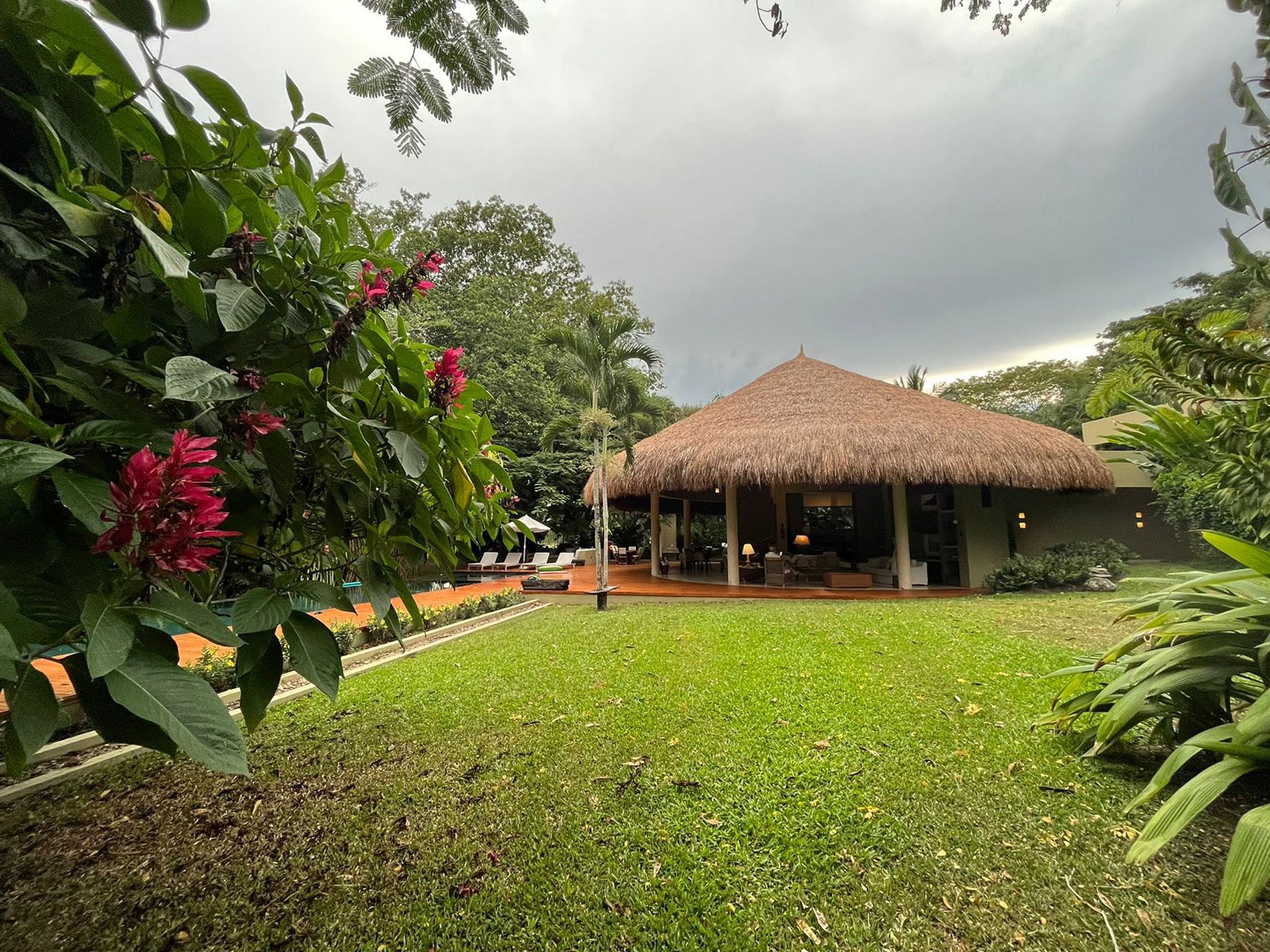 Saia para descobrir um grande quiosque de palapa próximo à refrescante piscina, cercado por vegetação exuberante. O espaço ao ar livre convida com uma área de churrasco, uma sala de jantar adicional e uma área de lounge, criando um cenário perfeito para relaxar e socializar.