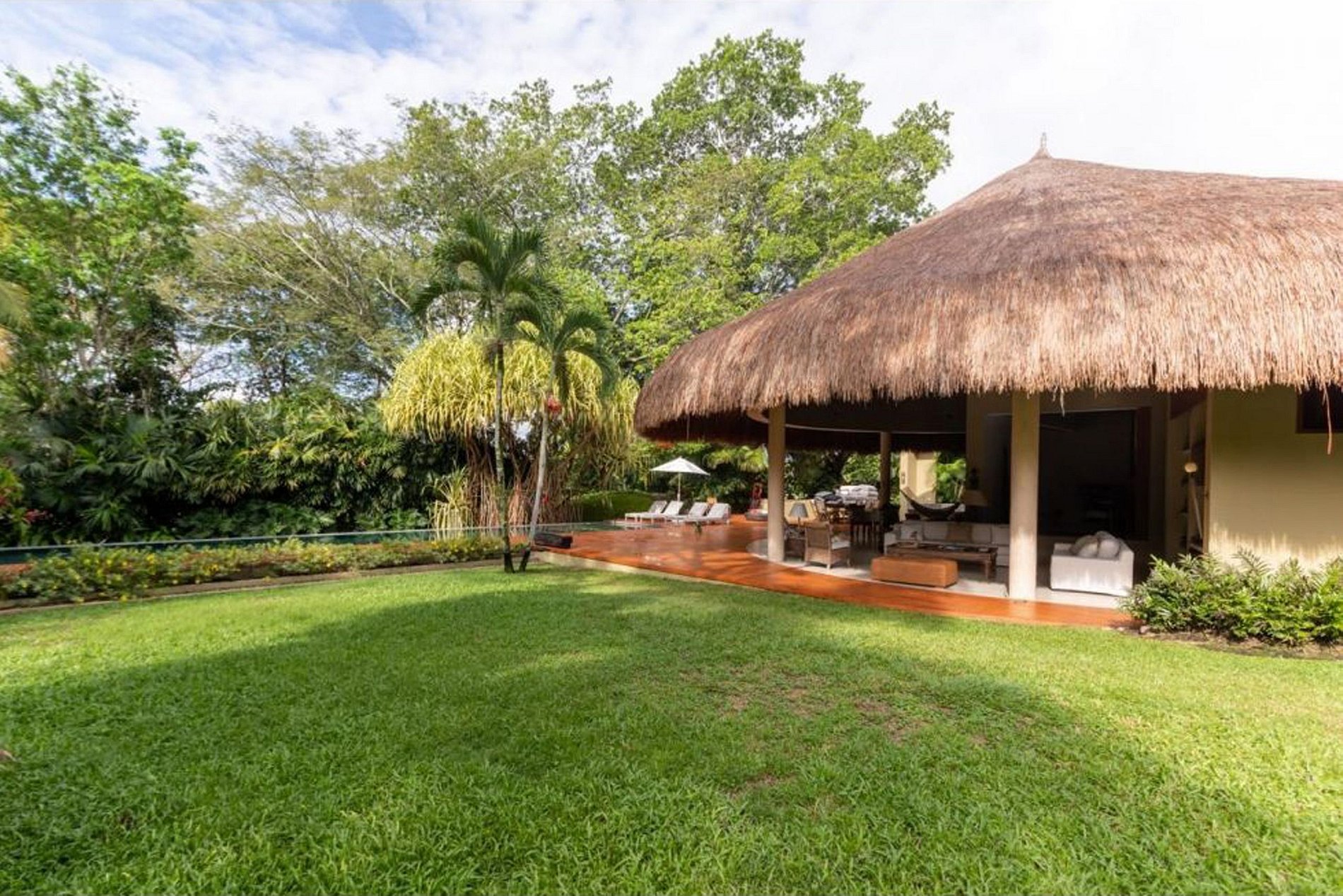 Na área externa, a experiência se completa com piscina, jacuzzi, churrasqueira e um amplo quiosque tipo palapa ideal para refeições ao ar livre. A distribuição permite integração fluida entre interior e exterior. Capacidade máxima: 16 hóspedes. Não são permitidas festas.