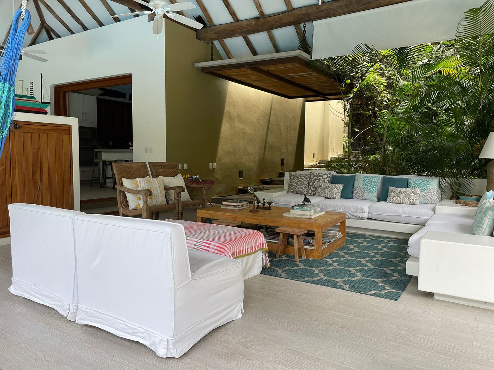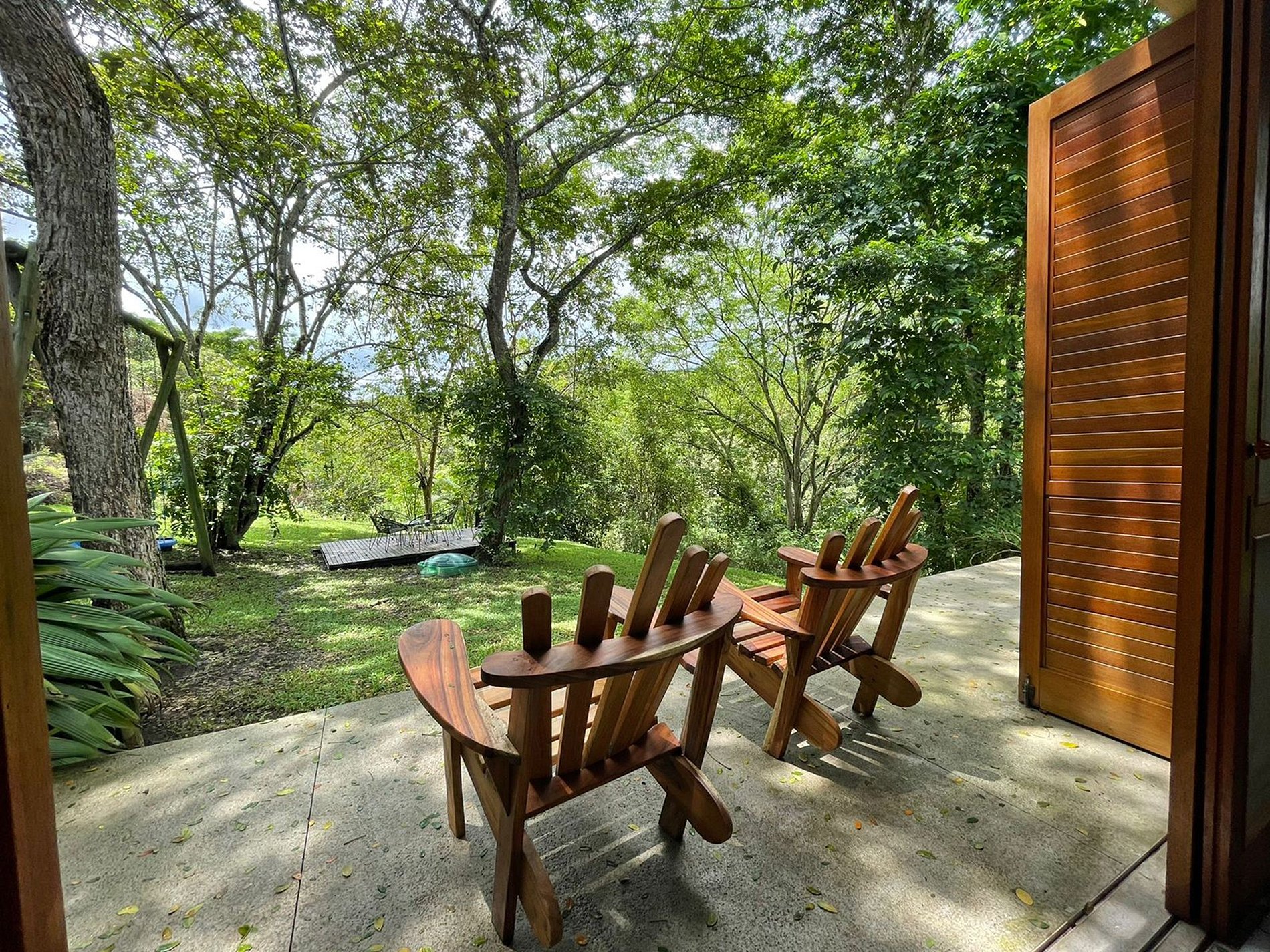 A abundância de vegetação que cerca a casa cria um pano de fundo sereno, promovendo uma sensação de paz e privacidade. Os espaços abertos em toda a propriedade convidam à conexão com a natureza, enquanto a área ao ar livre ao lado da piscina oferece um ambiente perfeito para o lazer, com assentos, área de jantar e espreguiçadeiras.
