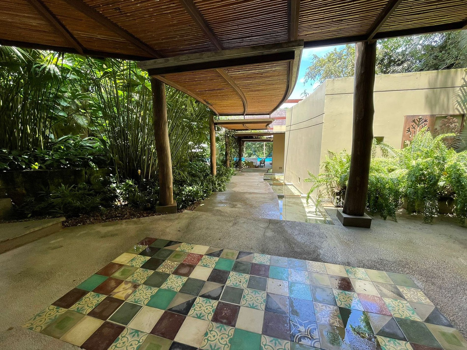 A abundância de vegetação que cerca a casa cria um pano de fundo sereno, promovendo uma sensação de paz e privacidade. Os espaços abertos em toda a propriedade convidam à conexão com a natureza, enquanto a área ao ar livre ao lado da piscina oferece um ambiente perfeito para o lazer, com assentos, área de jantar e espreguiçadeiras.