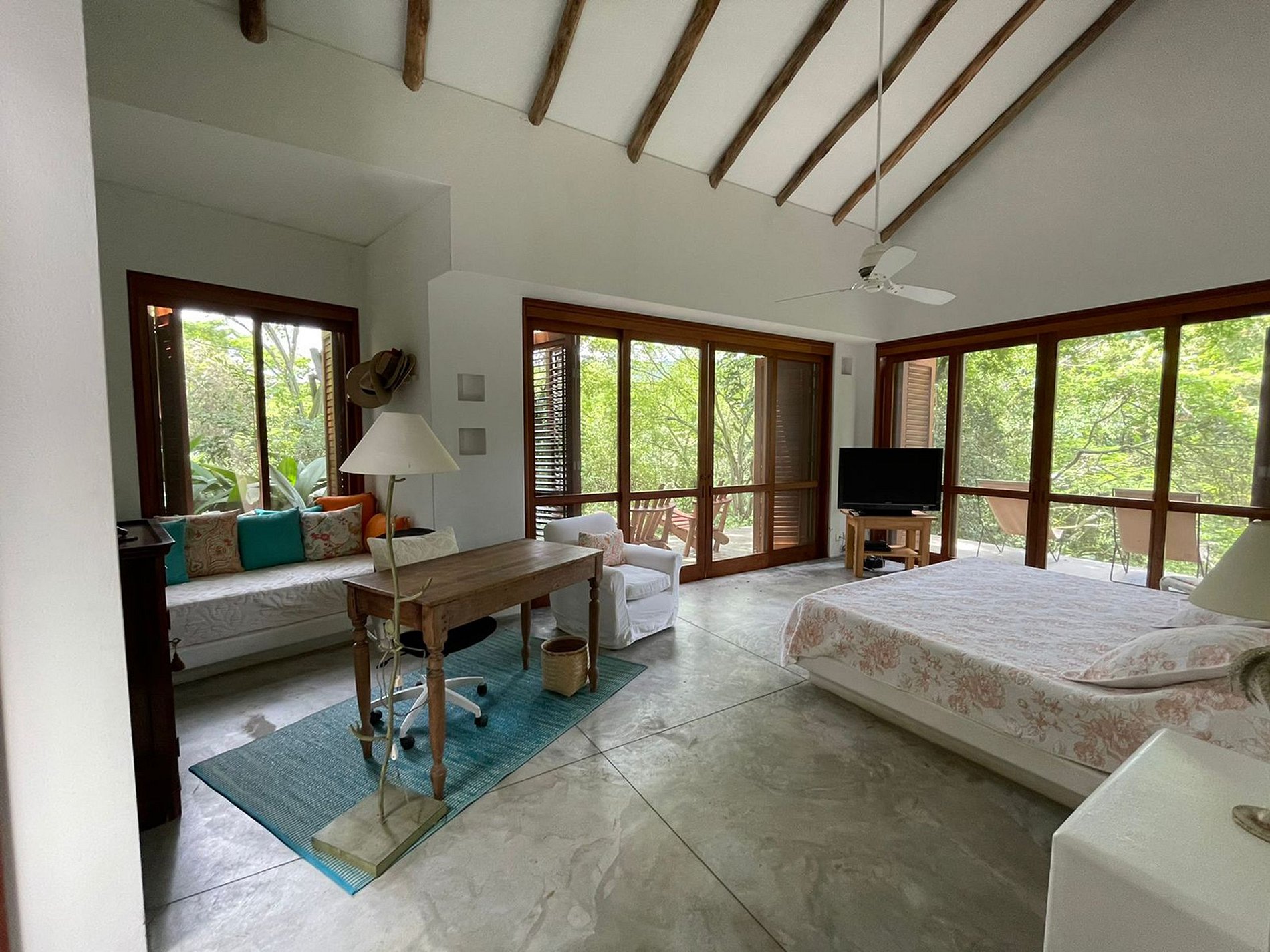 Cada quarto é cuidadosamente projetado, oferecendo uma variedade de arranjos para dormir, desde majestosas camas King até confortáveis Queens e Solteiras, todas aprimoradas por ventiladores de teto refrescantes. Enquanto o sol da manhã banha os arredores, desfrute das vistas panorâmicas da natureza que abraçam a residência.