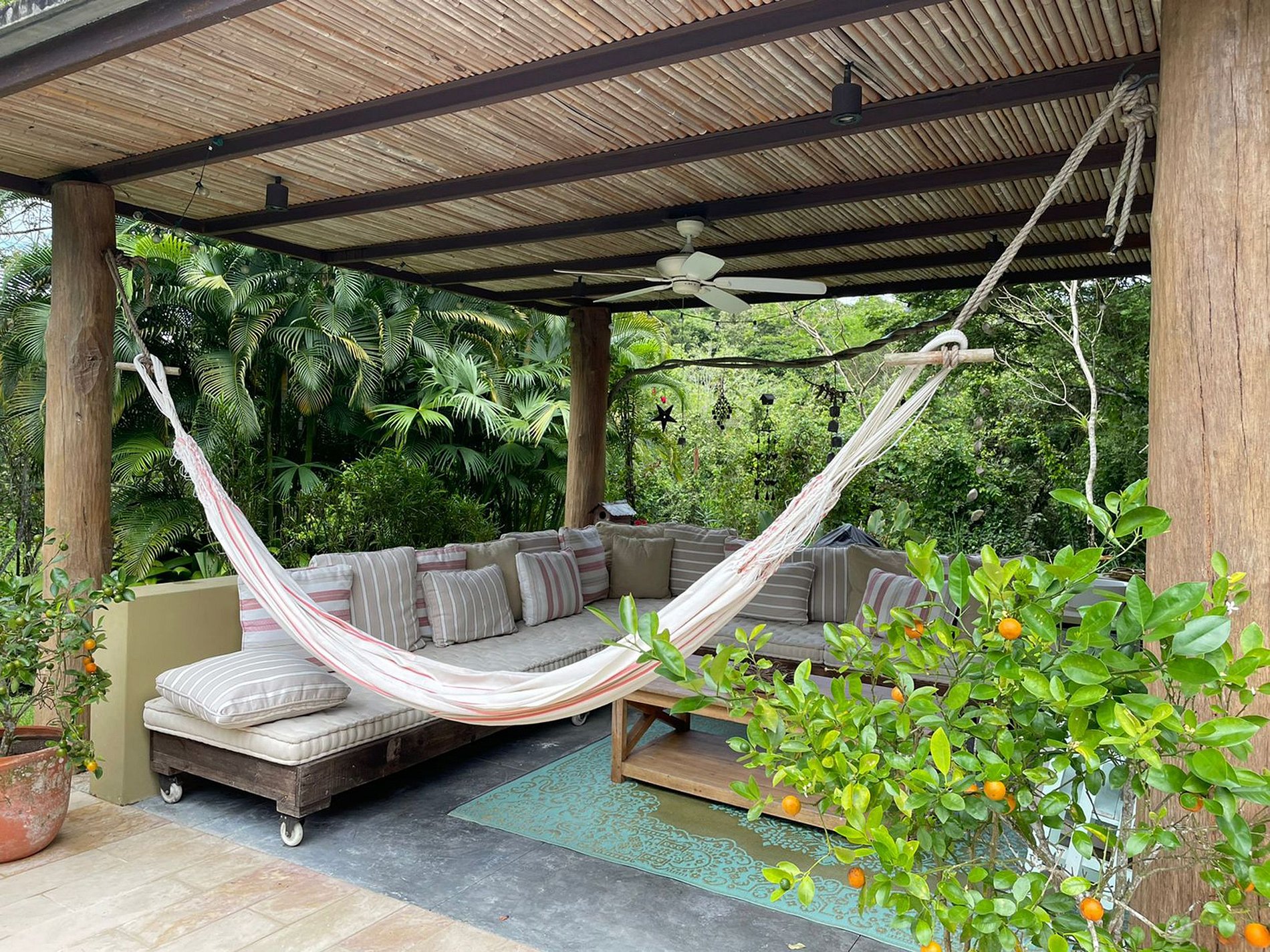 A abundância de vegetação que cerca a casa cria um pano de fundo sereno, promovendo uma sensação de paz e privacidade. Os espaços abertos em toda a propriedade convidam à conexão com a natureza, enquanto a área ao ar livre ao lado da piscina oferece um ambiente perfeito para o lazer, com assentos, área de jantar e espreguiçadeiras.