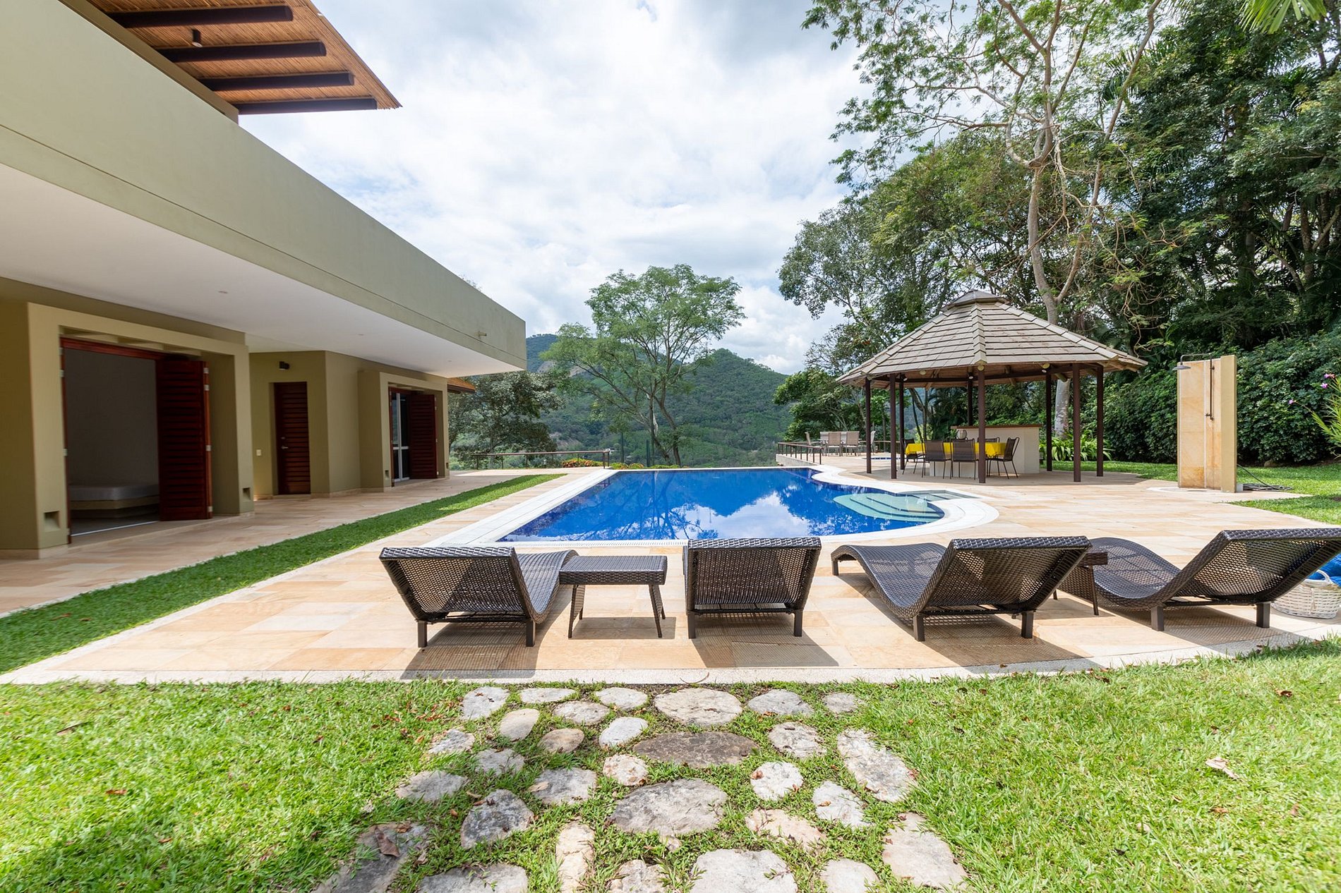 A vista da piscina segue direto para as montanhas da região, com flora diversificada e de grande beleza. O grande deck de pedra que cerca a piscina e a hidromassagem, leva os hóspedes em um passeio pelas flores do jardim até os interiores da propriedade.
