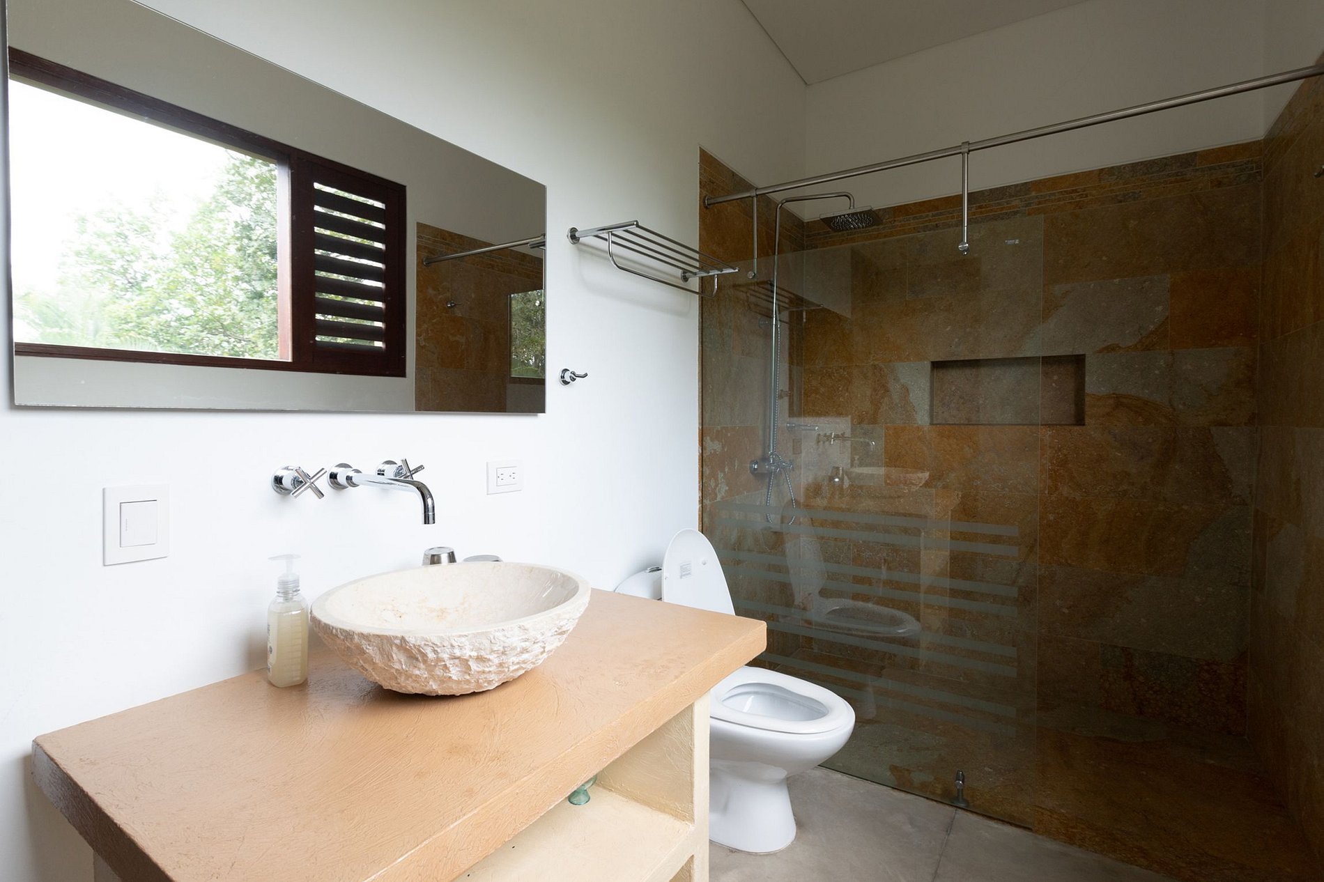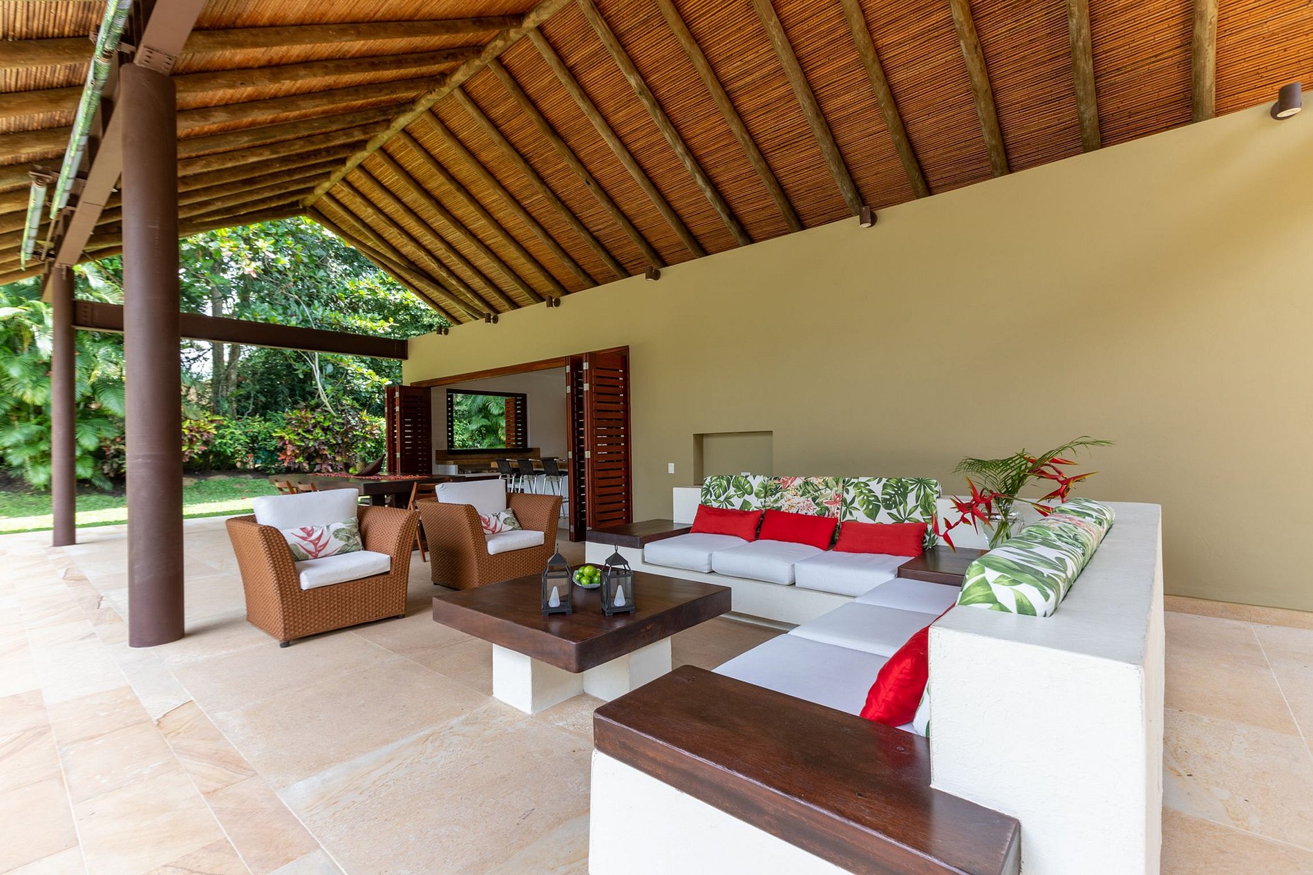 A cozinha gourmet se conecta e se abre completamente para a varanda que dá acesso a área de jantar, com uma grande mesa de madeira. O piso superior onde está localizado duas das suítes, conta com um terraço amplo que proporciona uma vista panorâmica de toda a flora local.
