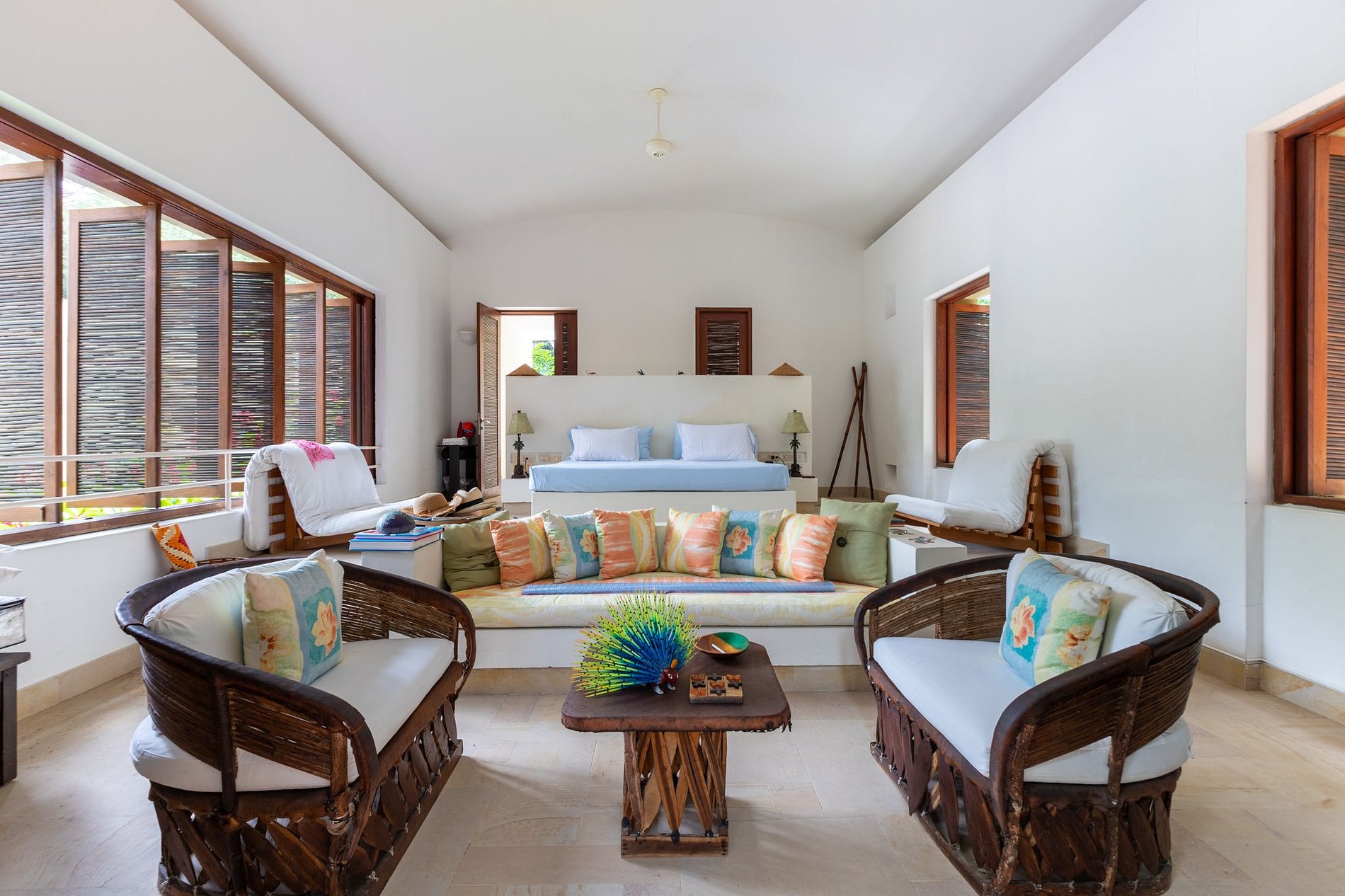 A sala de estar possuí uma decoração linda com móveis de madeira produzida com arquitetura local e combina com o ambiente tropical. A sala de jantar possuí um design clean e arejado tendo como decoração uma grande mesa de jantar com capacidade para 10 pessoas.