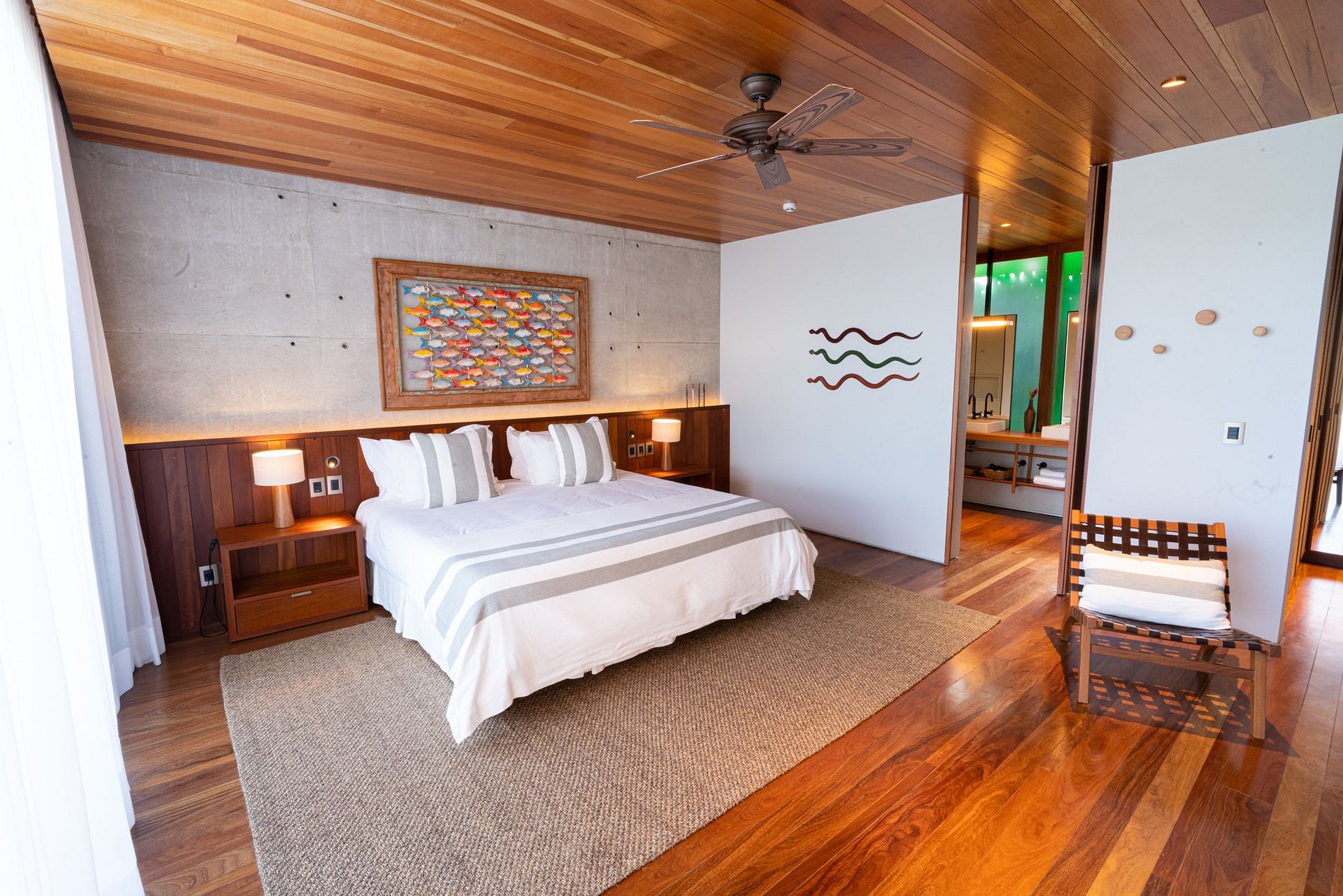 Oferecendo flexibilidade em acomodações, a villa possui um quarto com cama king size e três quartos que podem ser arranjados com cama queen ou duas camas de solteiro, acomodando confortavelmente até 8 pessoas. Localizada no topo de uma colina, o som do mar chega até você de maneira suave e relaxante, complementando a atmosfera de tranquilidade.