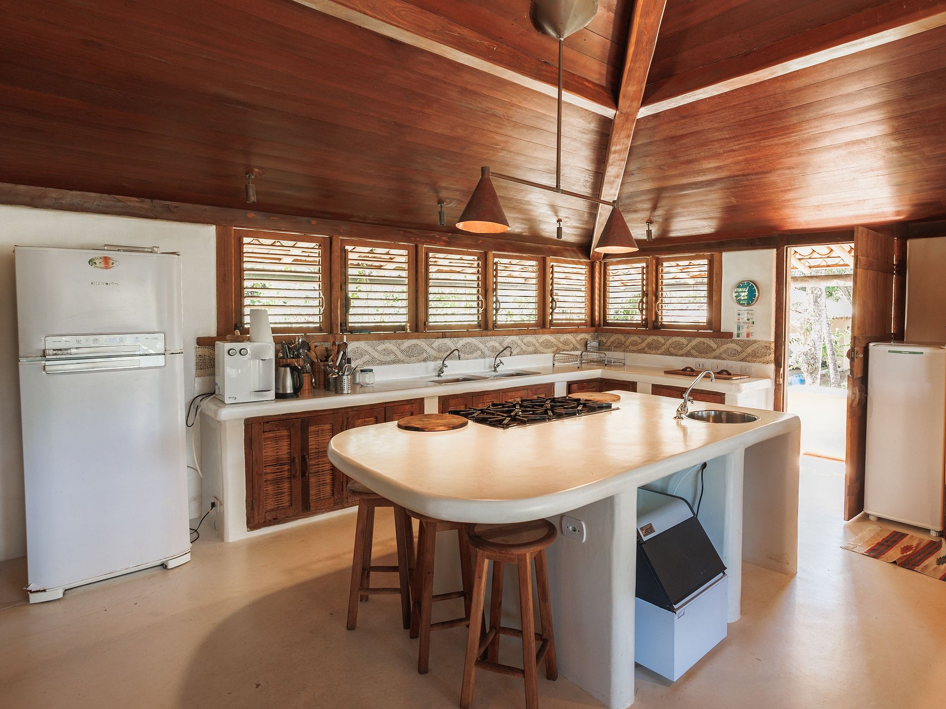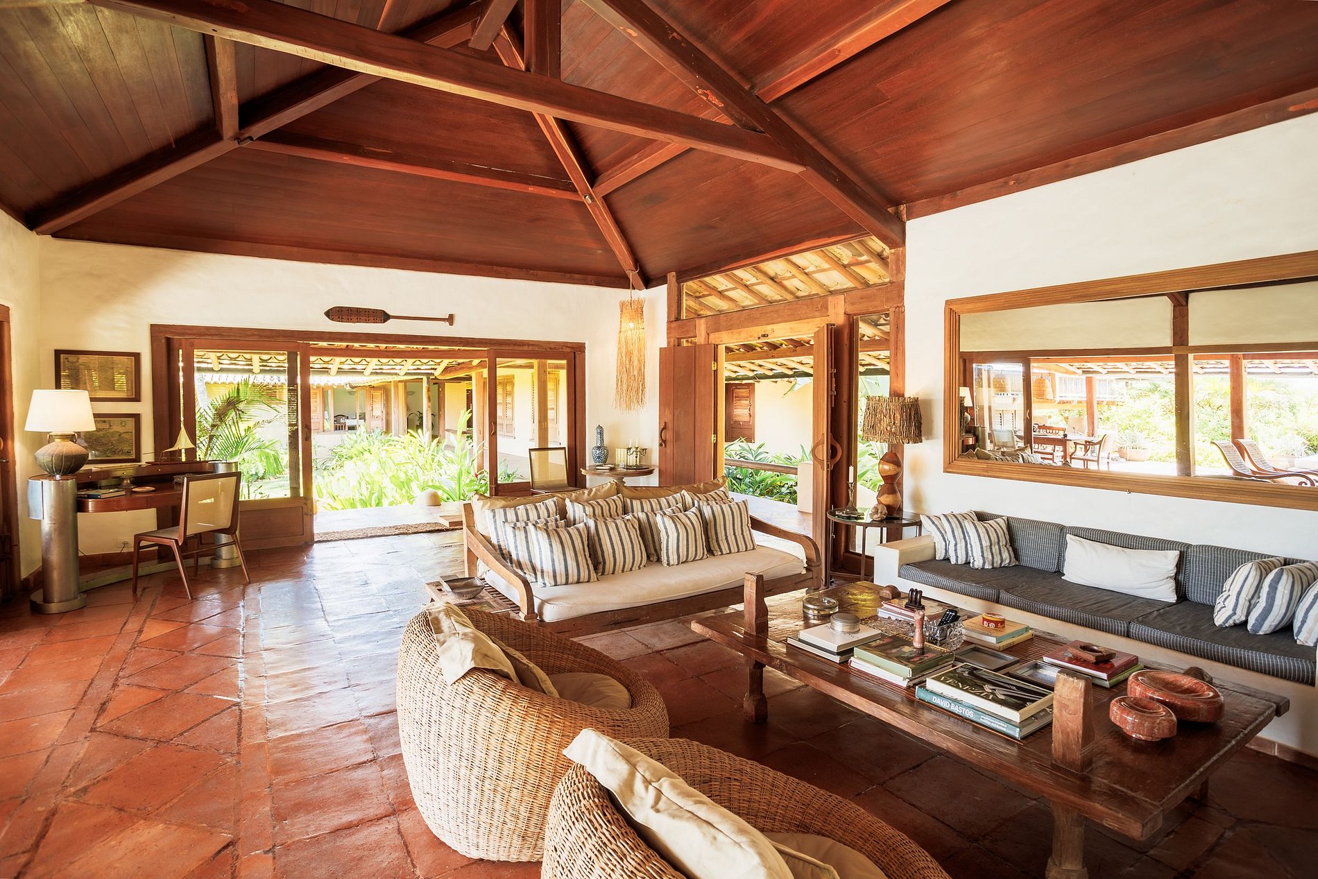 A casa principal, fica há 30 metros de caminhada do mar, conta com 5 quartos, sendo 3 suítes, todas com ar condicionado.