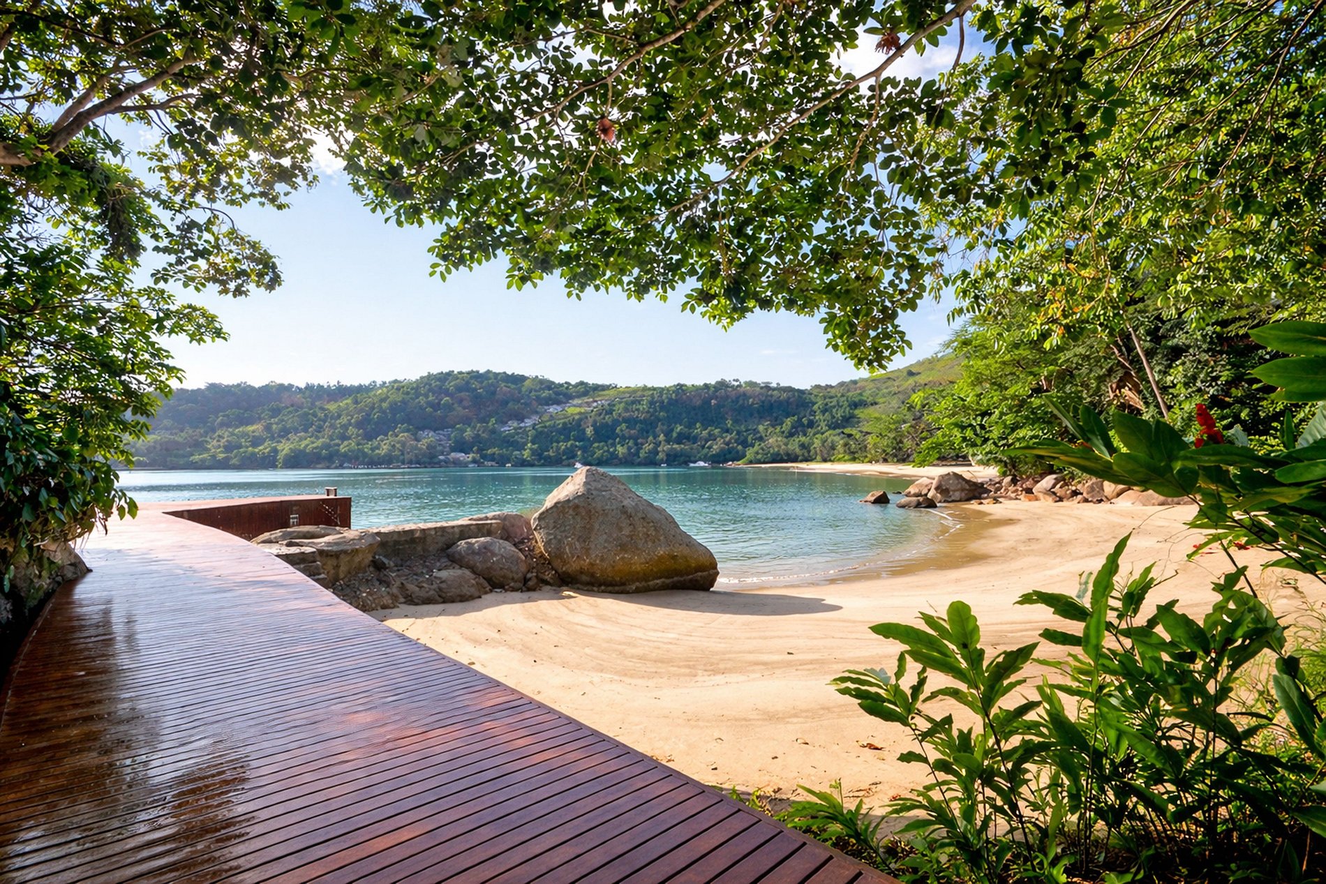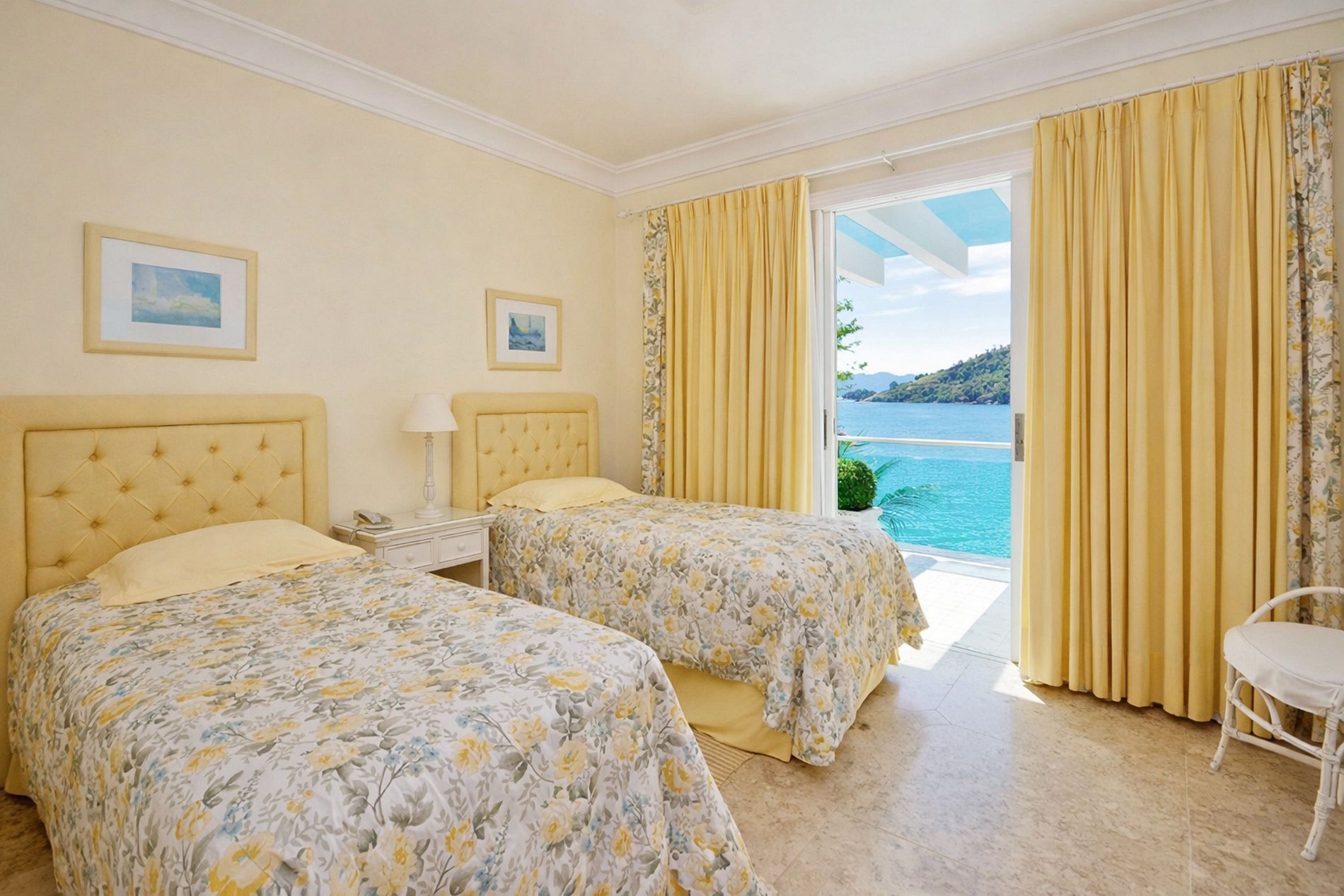 A propriedade conta com cinco suítes, todas com grandes janelas que emolduram belas vistas para a baía de Angra. Cada quarto recebe abundante luz natural, agradável ventilação cruzada e um ambiente sereno que potencializa a sensação de refúgio e bem-estar.