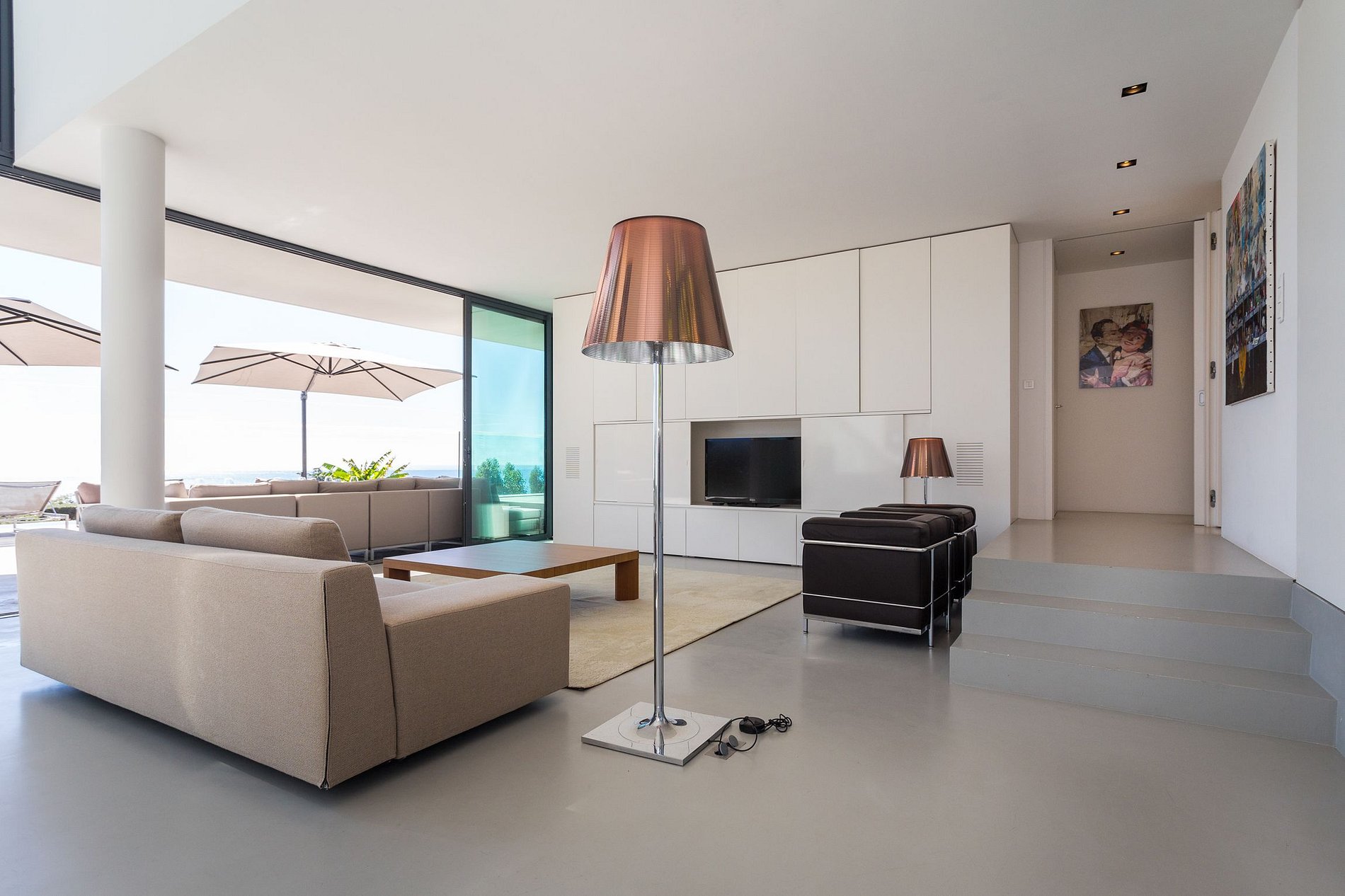 A casa tem um interior claro e limpo que se encaixa perfeitamente na área, piscina azul e ampla vista para o mar.
