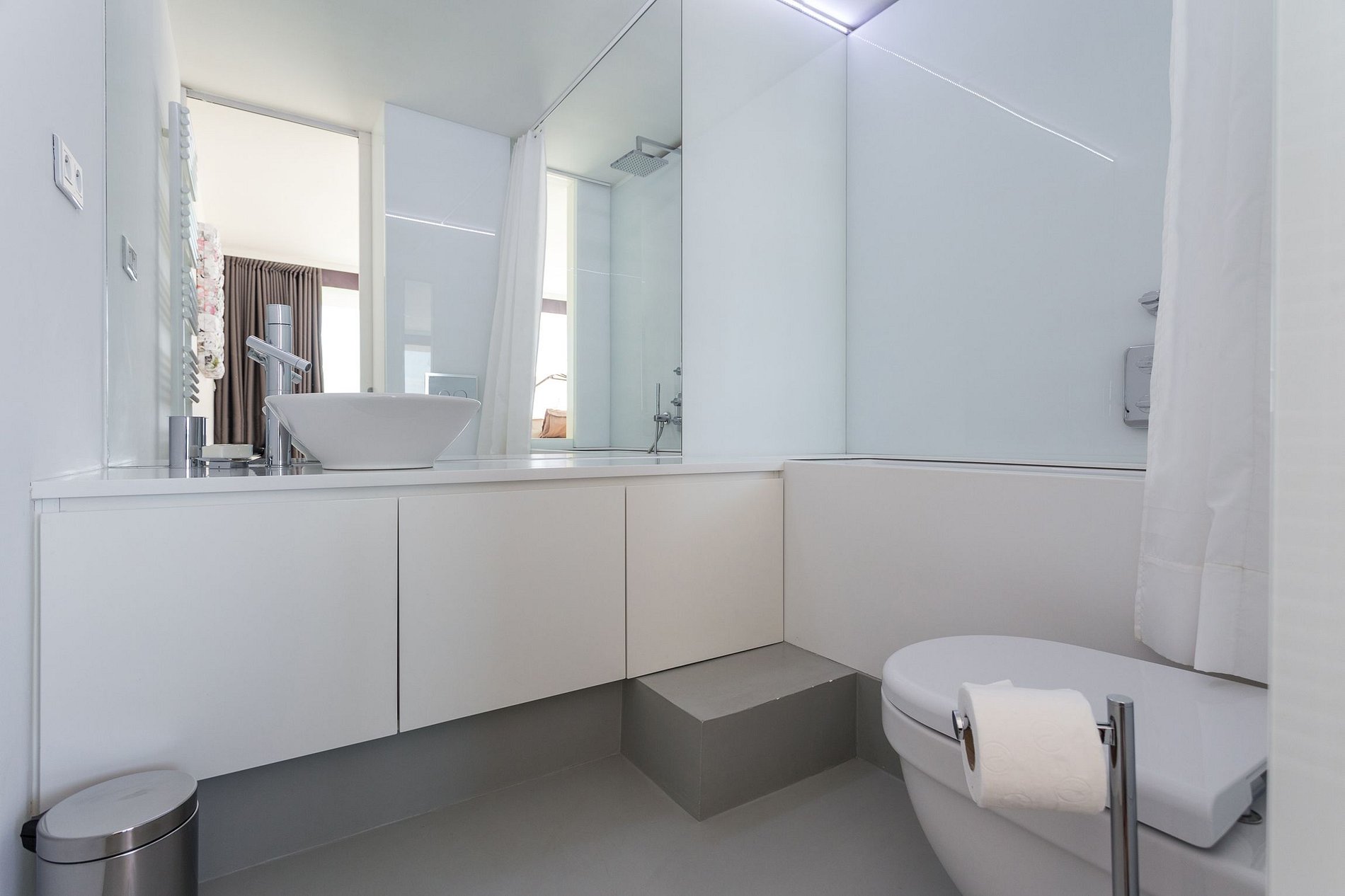 Uma grande sala de estar com sala de jantar oferece uma bela vista para o mar através de janelas muito grandes. A cozinha totalmente equipada está aberta para a sala de estar. Há também um banheiro separado na sala de estar.