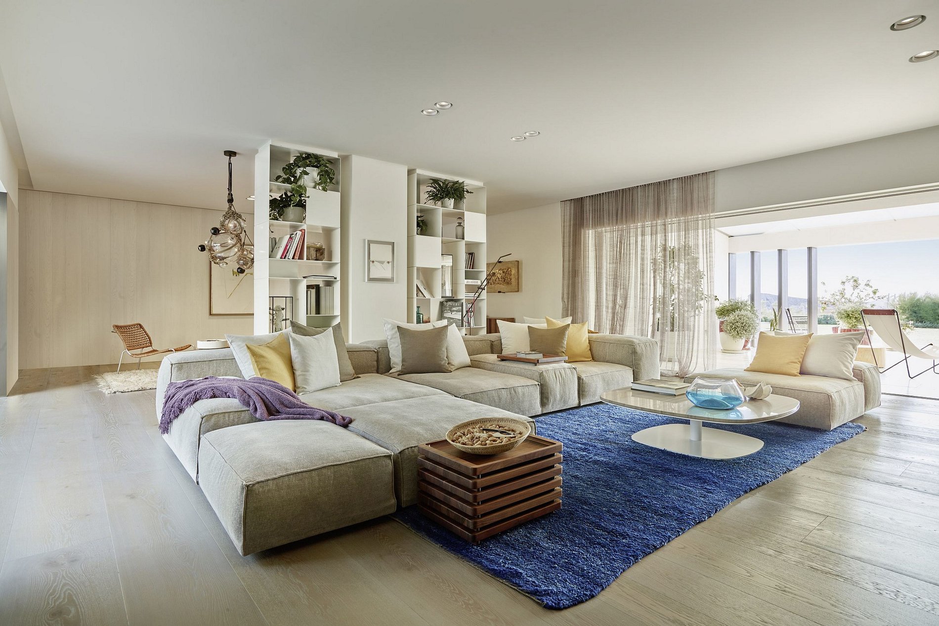 Por dentro, a villa exala uma vibe serena de Ibiza com seus espaços frescos e arejados vestidos em texturas naturais quentes, tons neutros e arte local selecionada, encarnando a essência relaxada da ilha. O coração da villa, um amplo pátio central, é cercado por três salas de estar elegantemente decoradas e uma sala de jantar, todas adornadas em um estilo Balear chic. Janelas do chão ao teto retraem-se perfeitamente nas paredes, mesclando a elegância interior com o charme ao ar livre em várias terraças, oferecendo bares, áreas tranquilas para relaxar e opções de refeições ao ar livre.