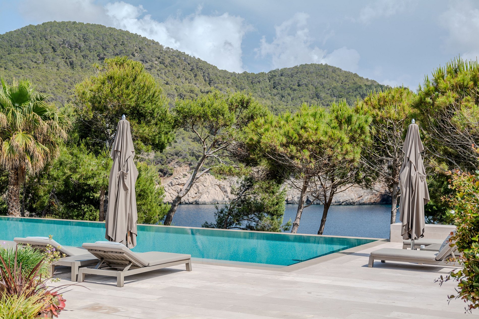 O exterior da ilha é um refúgio para relaxamento e indulgência, apresentando duas piscinas deslumbrantes: uma piscina infinita de 23 metros adornada com espreguiçadeiras e uma piscina estilo lagoa situada dentro de exuberantes jardins tropicais.