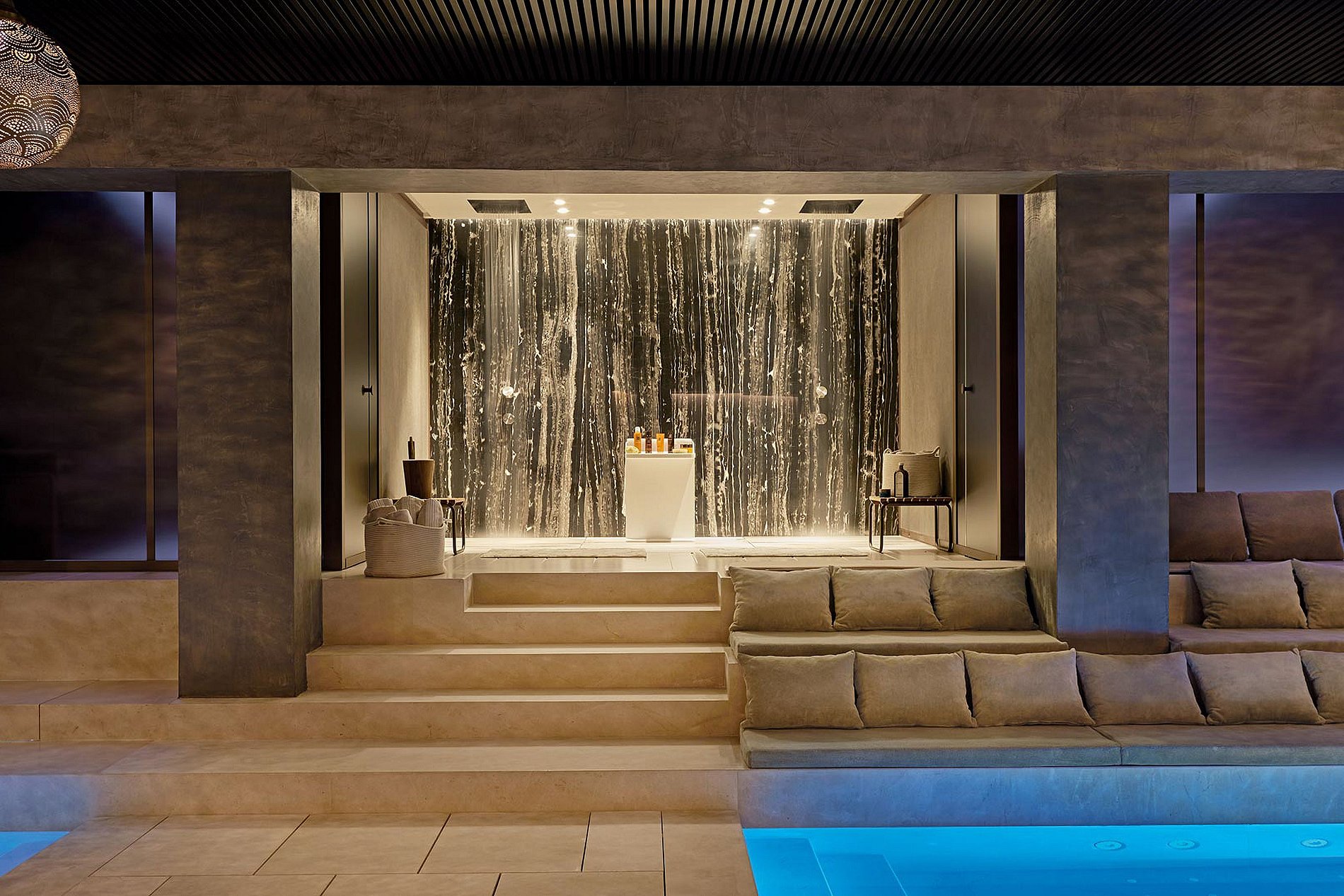 O exterior da ilha é um refúgio para relaxamento e indulgência, apresentando duas piscinas deslumbrantes: uma piscina infinita de 23 metros adornada com espreguiçadeiras e uma piscina estilo lagoa situada dentro de exuberantes jardins tropicais.