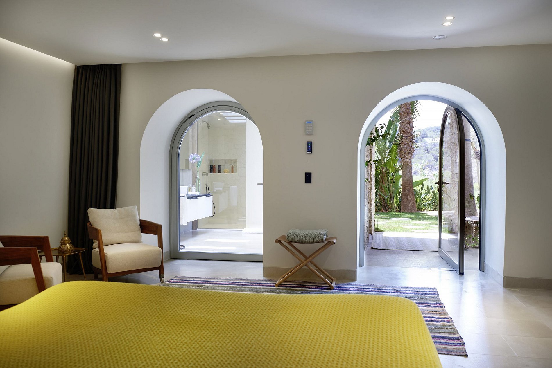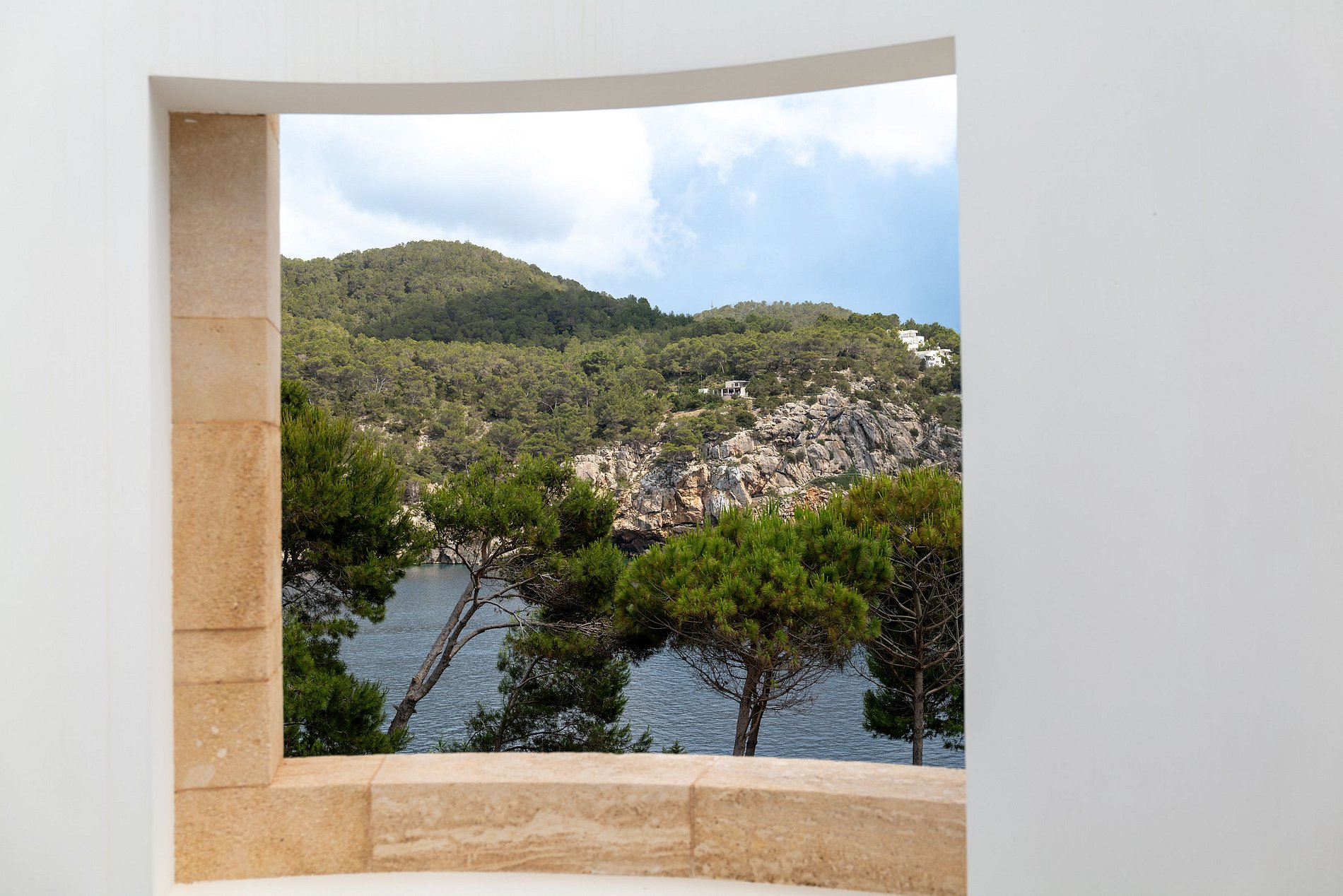 Por dentro, a villa exala uma vibe serena de Ibiza com seus espaços frescos e arejados vestidos em texturas naturais quentes, tons neutros e arte local selecionada, encarnando a essência relaxada da ilha. O coração da villa, um amplo pátio central, é cercado por três salas de estar elegantemente decoradas e uma sala de jantar, todas adornadas em um estilo Balear chic. Janelas do chão ao teto retraem-se perfeitamente nas paredes, mesclando a elegância interior com o charme ao ar livre em várias terraças, oferecendo bares, áreas tranquilas para relaxar e opções de refeições ao ar livre.