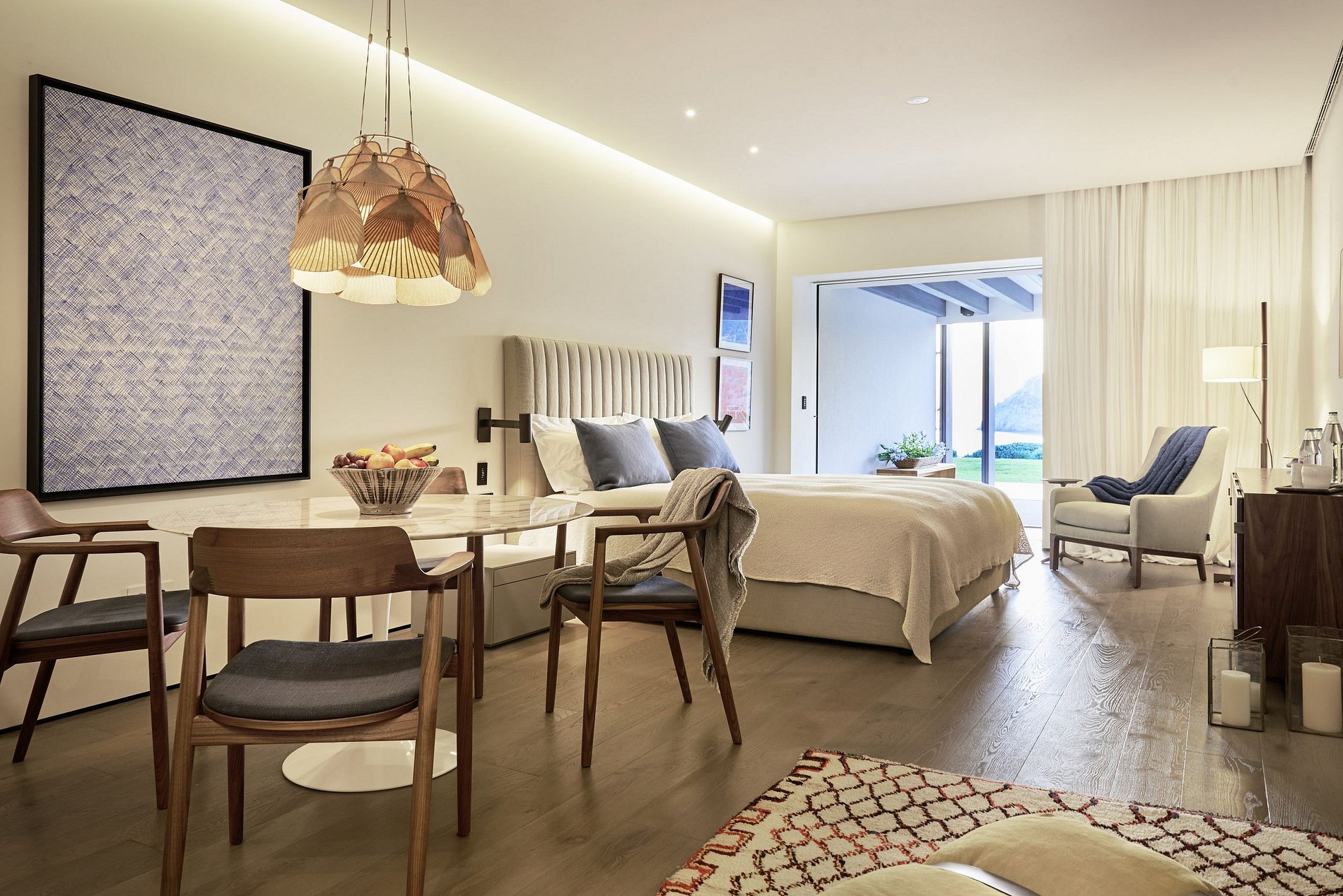 As acomodações incluem uma suíte master suntuosa e oito quartos com banheiro privativo, alguns com designs semi a céu aberto, com opções luxuosas adicionais para hóspedes extras.