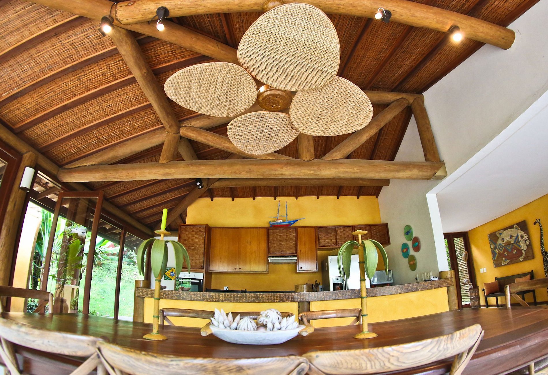 Sua cozinha chama atenção pela cor amarela das paredes que simbolizam o verão, é completa e equipada com modernos eletrodomésticos para o preparo de saborosas refeições no fogão e carnes na churrasqueira e uma larga mesa de jantar com capacidade de 8 pessoas.