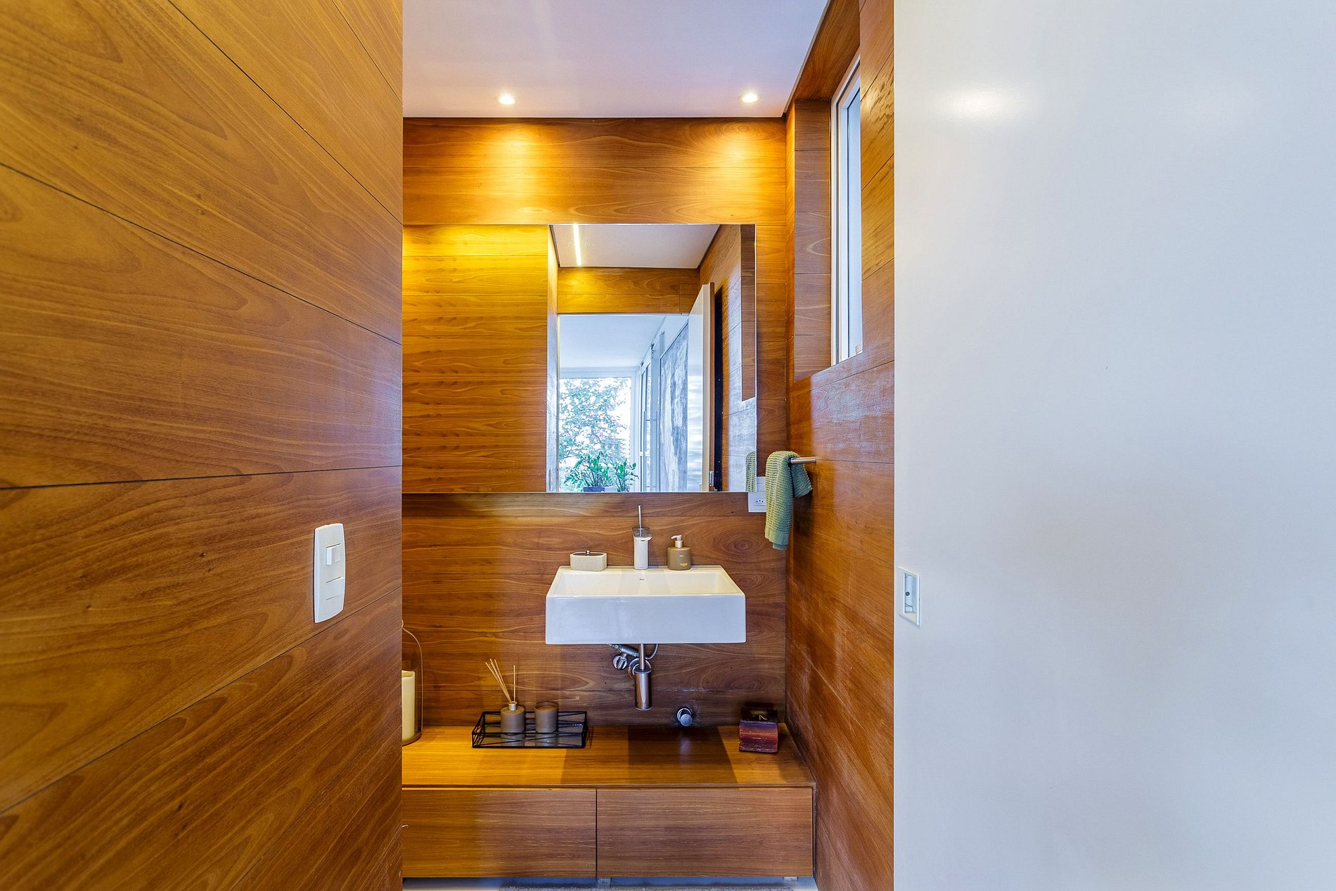 Situada em um condomínio em uma colina, esta casa explora essa característica como uma vantagem única e por isso é detentora de uma vista de cair o queixo. São mais de 1000 m² de área da propriedade avistando o oceano panoramicamente e sem obstruções.