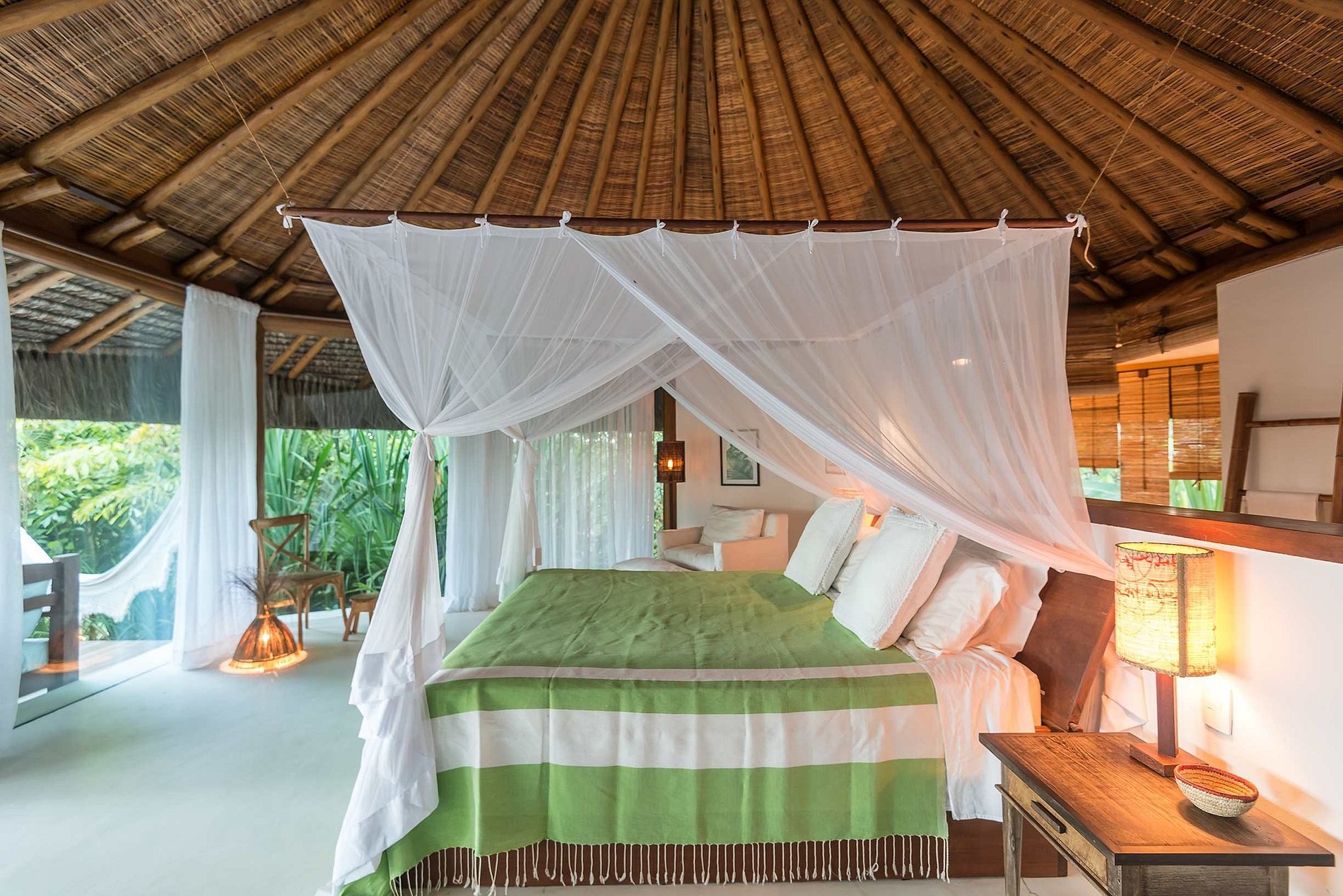Ao lado da piscina, a quarta suíte de 80 m2 e de pé direito alto, com seu impressionante teto de fibra de dendê é mais uma suíte, com parede de vidro, para aproveitar da vida e das ricas plantas do jardim.