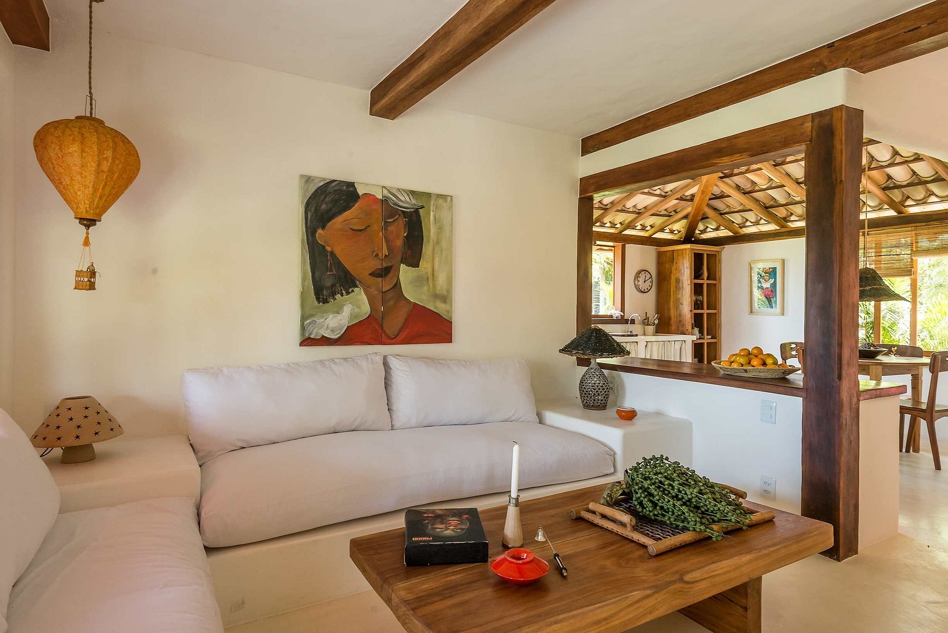 Os hóspedes podem curtir o imenso espaço no térreo da casa principal, formados por 2 salões interna, as mesas convidativas da cozinha aberta e de uma grande área externa coberta , com seus sofás, poltronas e obras de artes locais.