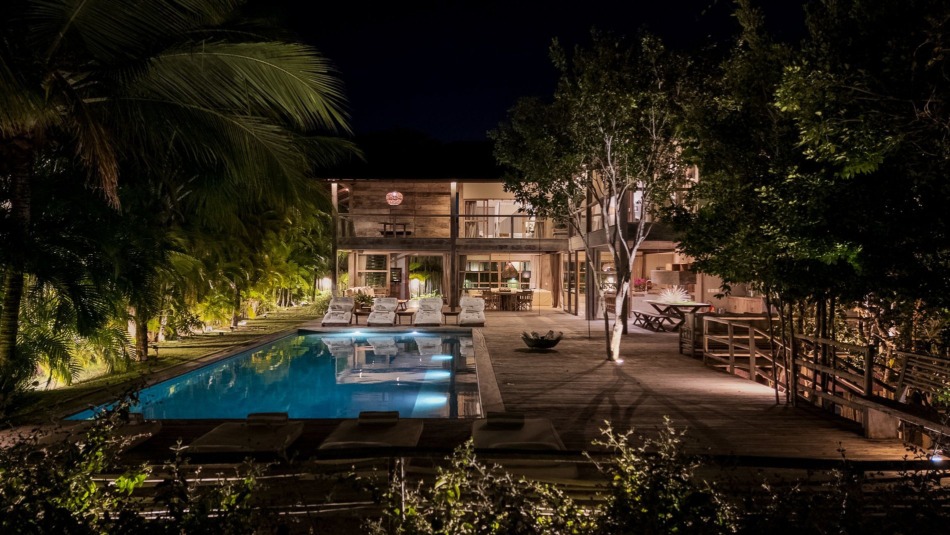 Ampla área externa com piscina privativa, espreguiçadeiras e um belo paisagismo com coqueiros e árvores tropicais. Os ambientes integrados com vidro e madeira permitem iluminação natural e ventilação cruzada, criando um ambiente leve e acolhedor.