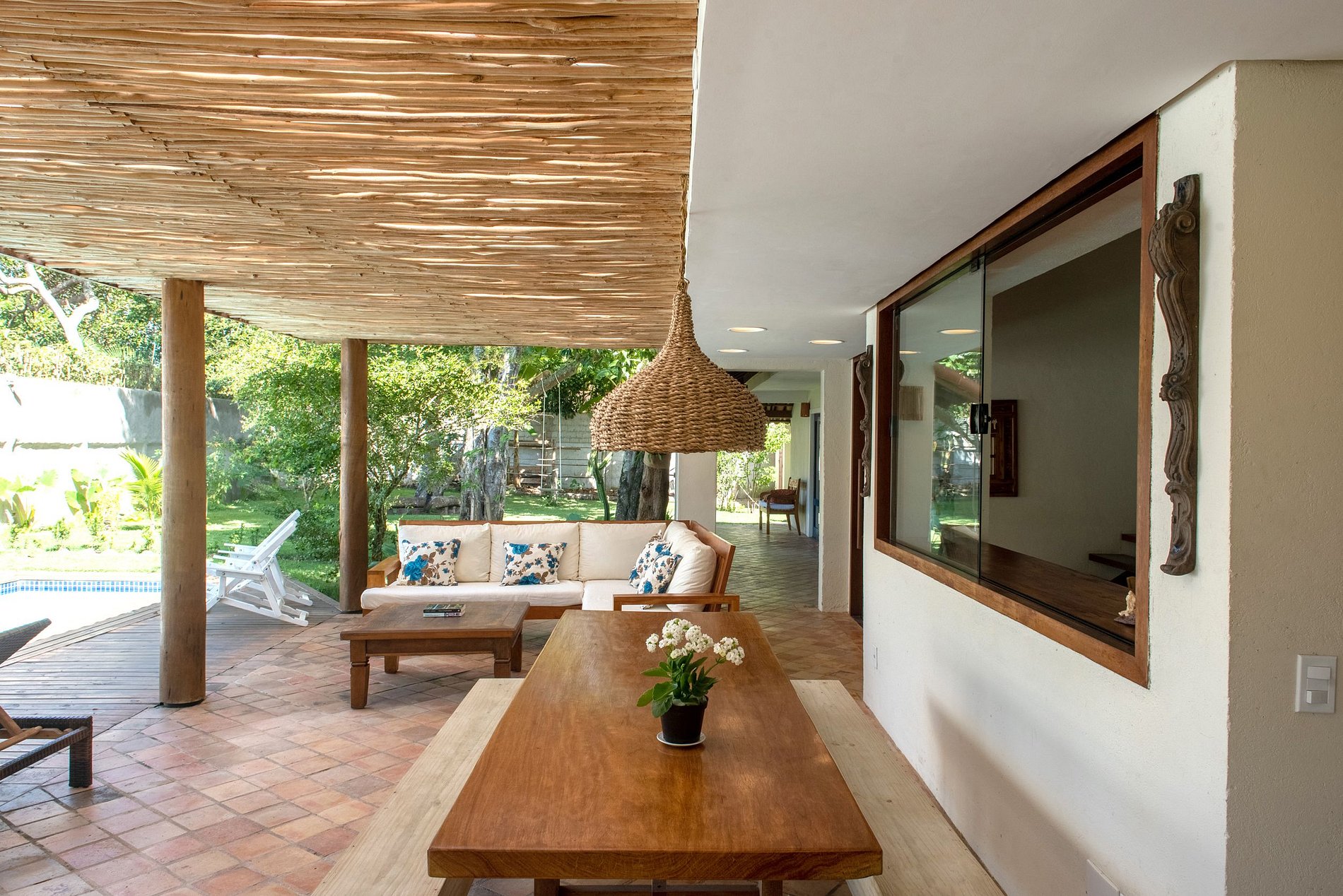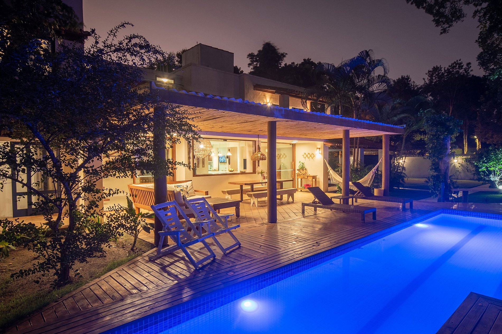Seu belo jardim é decorado com árvores e um largo deck com piscina, espreguiçadeiras, cama com mosquiteiro e uma churrasqueira para o preparo deliciosos churrascos entre família e amigos. Sua varanda incluí um excelente living externo com área de refeições a poucos passos da piscina.