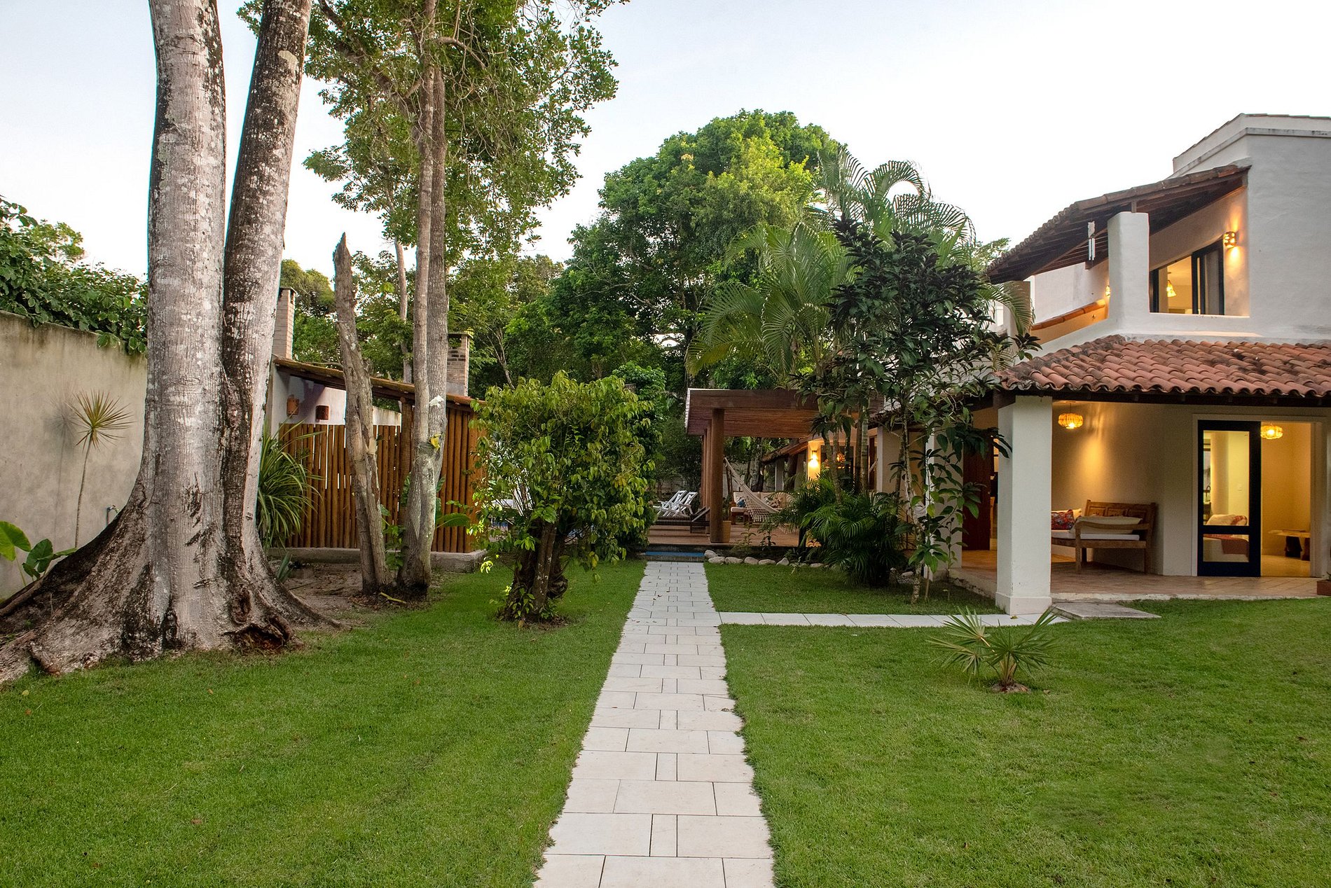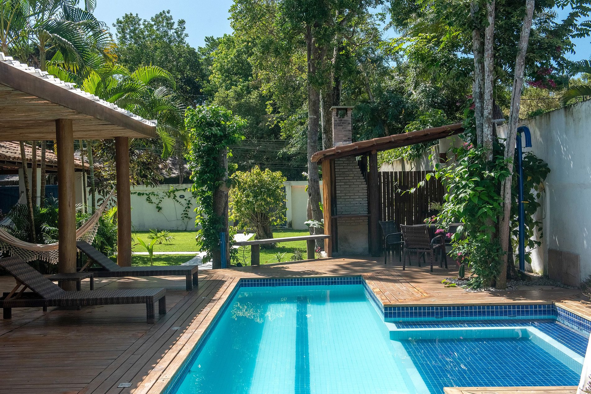 Seu belo jardim é decorado com árvores e um largo deck com piscina, espreguiçadeiras, cama com mosquiteiro e uma churrasqueira para o preparo deliciosos churrascos entre família e amigos. Sua varanda incluí um excelente living externo com área de refeições a poucos passos da piscina.