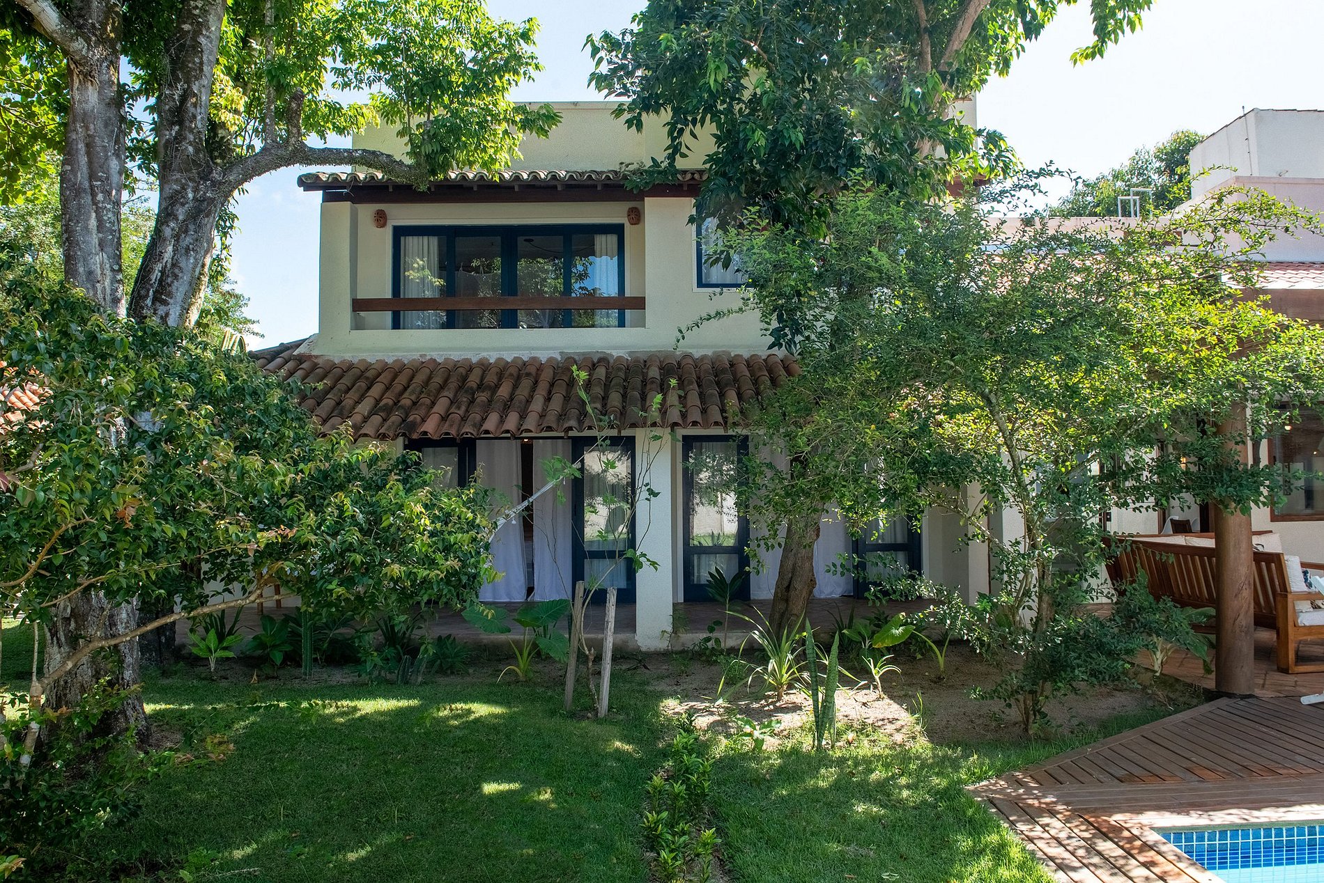 Seu belo jardim é decorado com árvores e um largo deck com piscina, espreguiçadeiras, cama com mosquiteiro e uma churrasqueira para o preparo deliciosos churrascos entre família e amigos. Sua varanda incluí um excelente living externo com área de refeições a poucos passos da piscina.