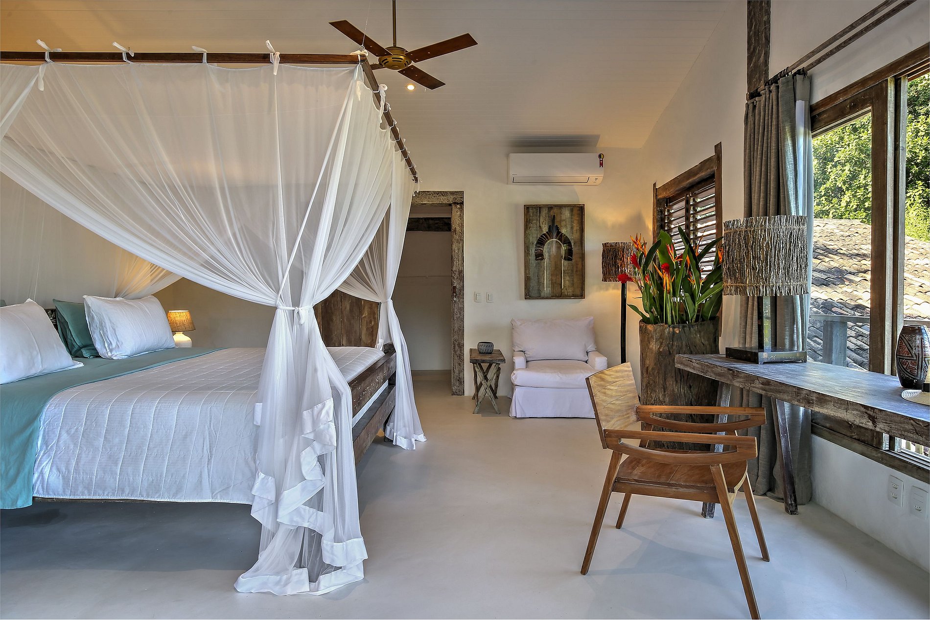 Master 1 - Andar Superior: Cama king size, cofre, mosquiteiro, ar condicionado e espaçosa varanda;
